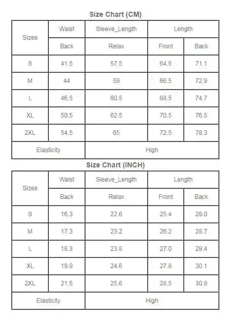 | Size | Waist | Sleeve Length | Back Length | Front Length |