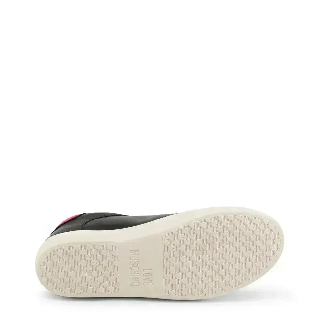 Adorable Love Moschino sneakers with rainbow hearts and colorful shoe laces.  These logo shoes feature the words "Love Moschino" on the side.  They are designed for comfort.