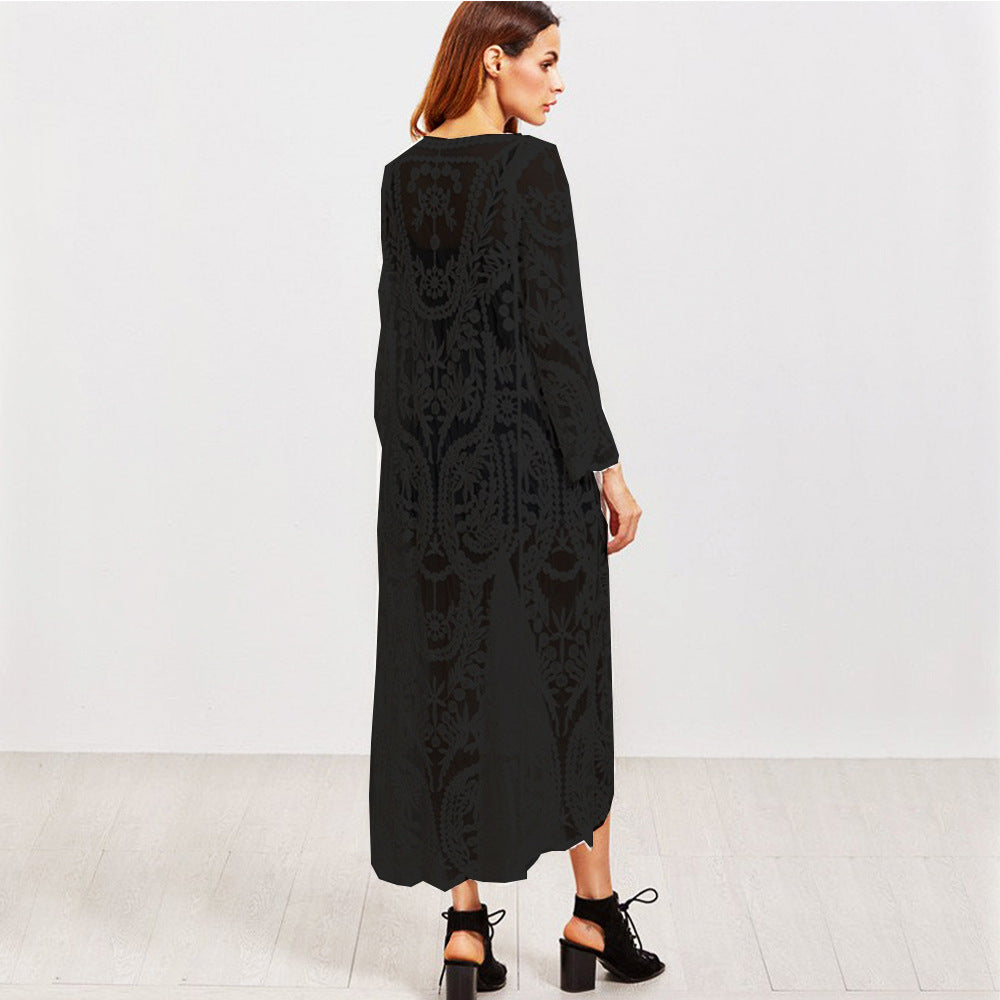 Bohemian Holiday Long Wheat Embroidered Lace Gauzy Cardigan Sun Protection Shirt Beach Cover Up