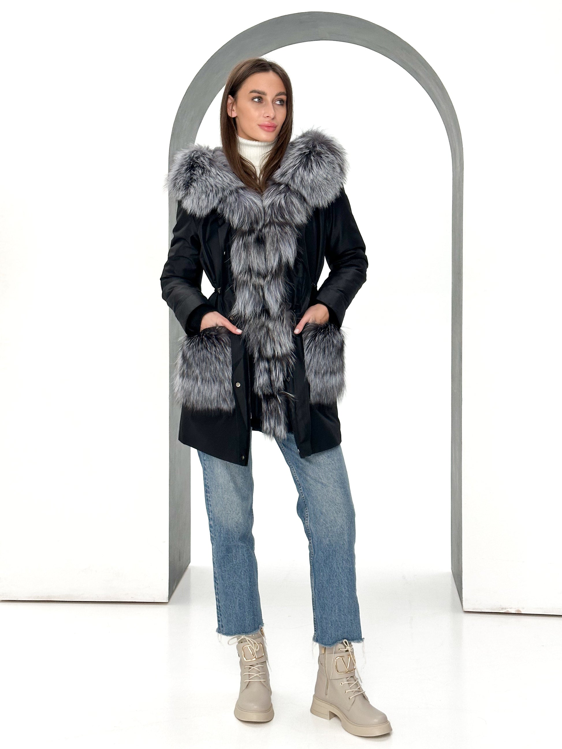 - Trim: genuine Silver fox fur