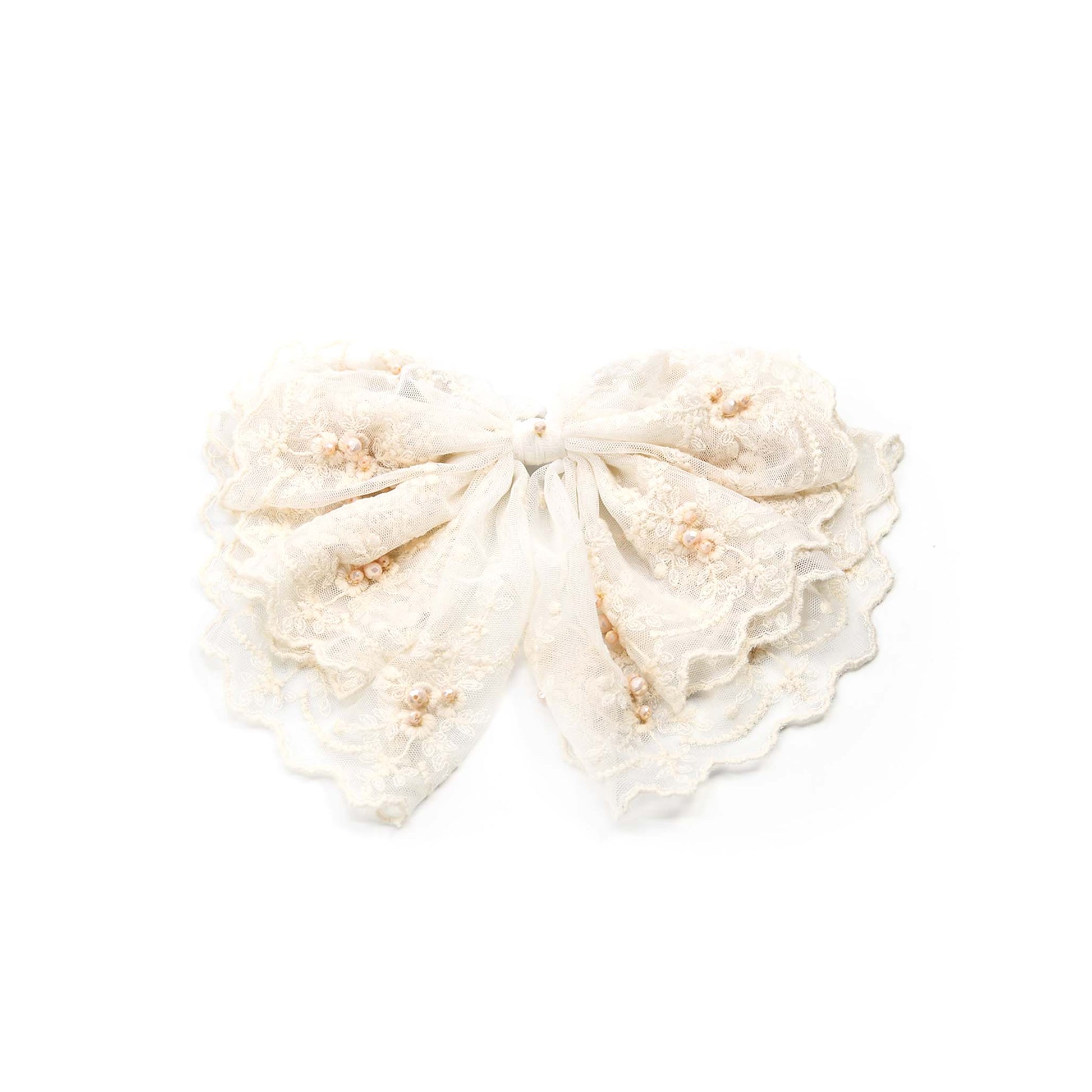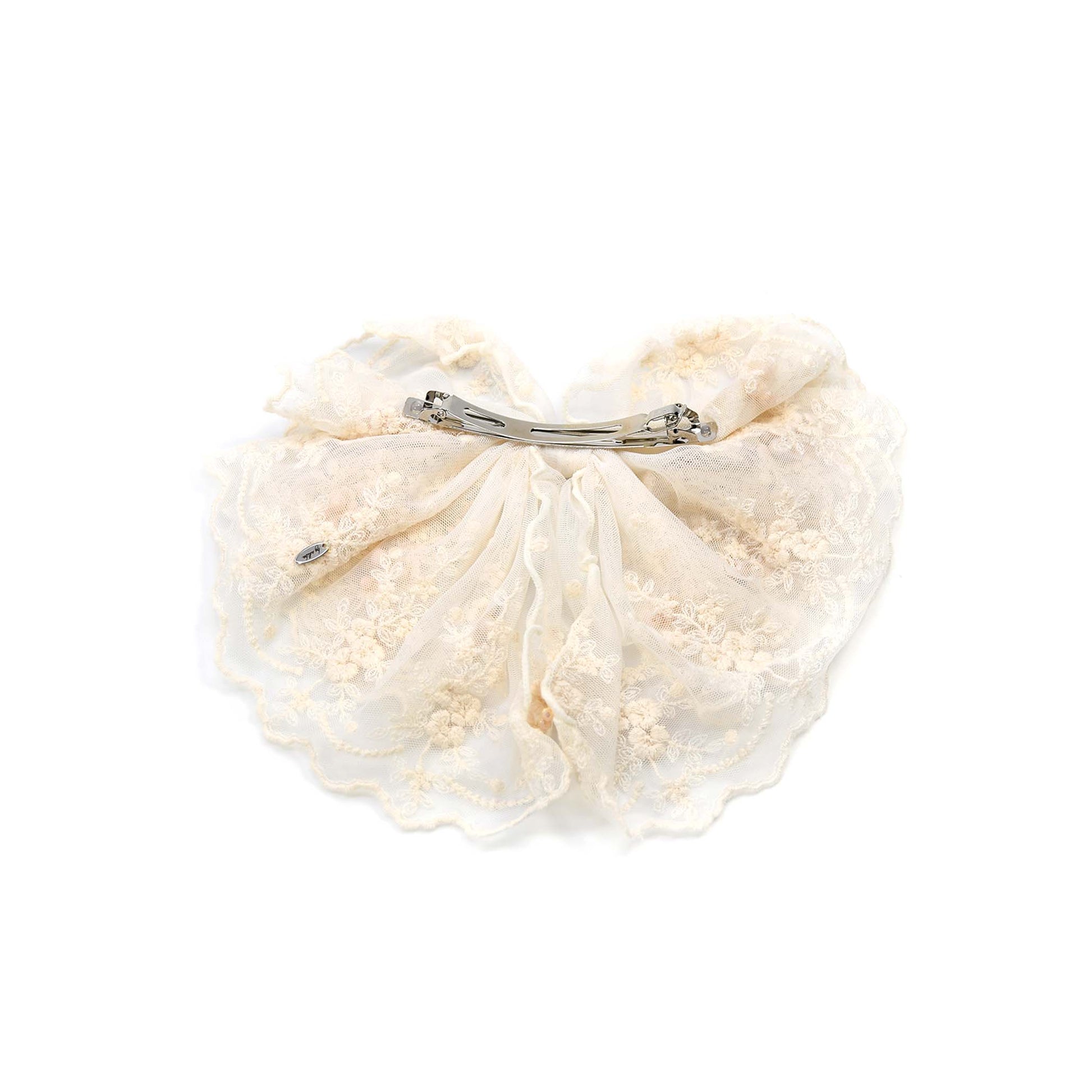 Milky Way Hair Barrette is handmade with floral lace ivory fabric and delicately hand-sewn with beautiful neutral/ivory glass beads for a beautiful shine. Milky Way Hair Barrette has a dreamy look featuring layers of lace drape fabric and steel french barrette clip.