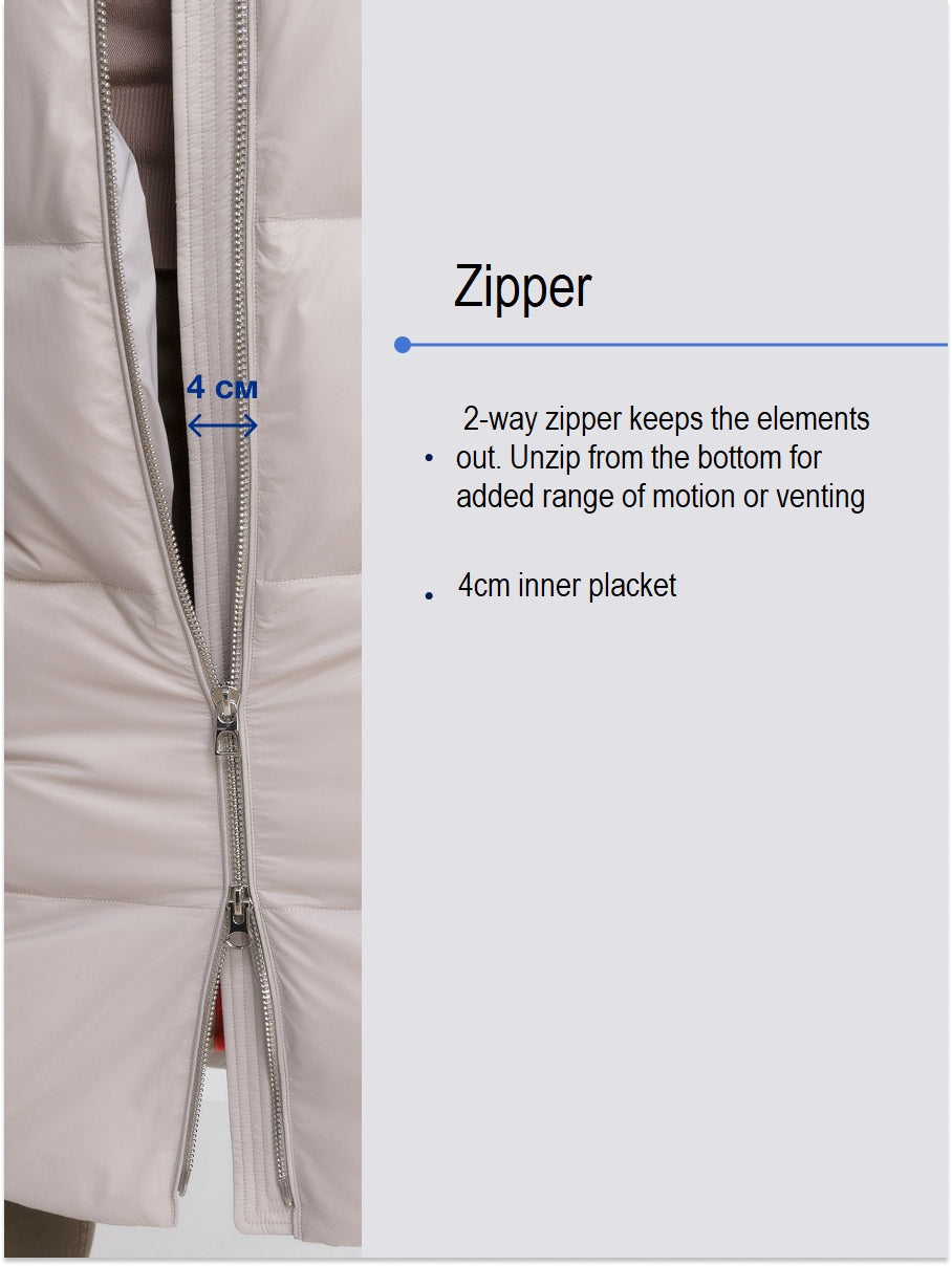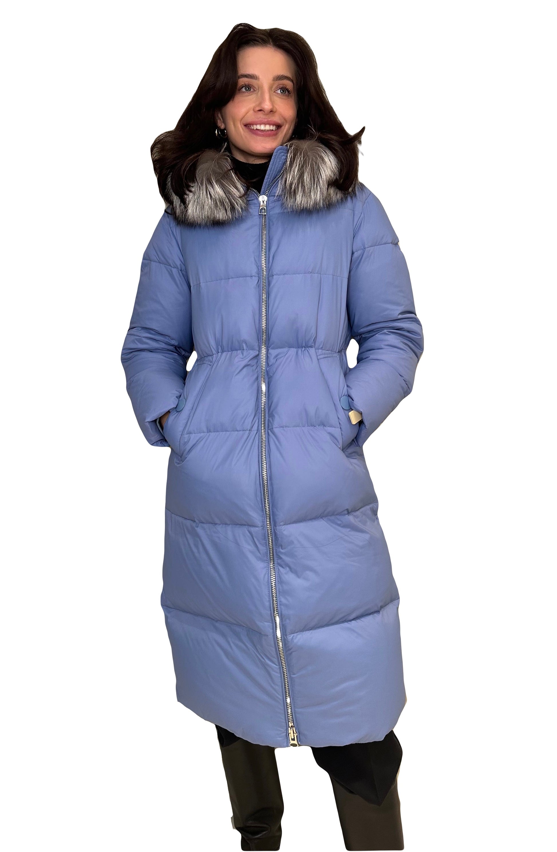 Alaska®`s luxurious warm yet lightweight Premium line coat insulated with white duck down and trimmed with genuine Silver fox fur. This full length coat is crafted from the durable super soft and water-repellent fabric that is designed to face harsh elements.