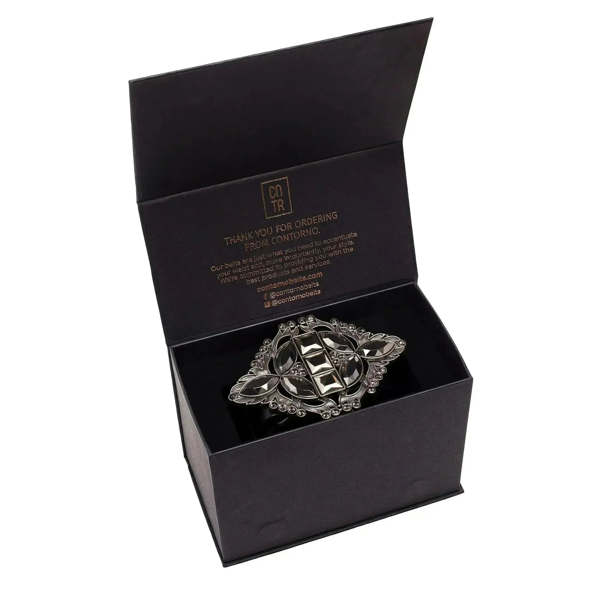 Featuring round, square, and petal-shaped stones, the Paloma Belt exudes casual elegance. This women’s leather belt is crafted with an ornate buckle adorned with translucent black faceted stones and a full grain leather strap with a single strap keeper. The neutral black hue makes it perfect for pairing with jeans and a black top or a little black dress.