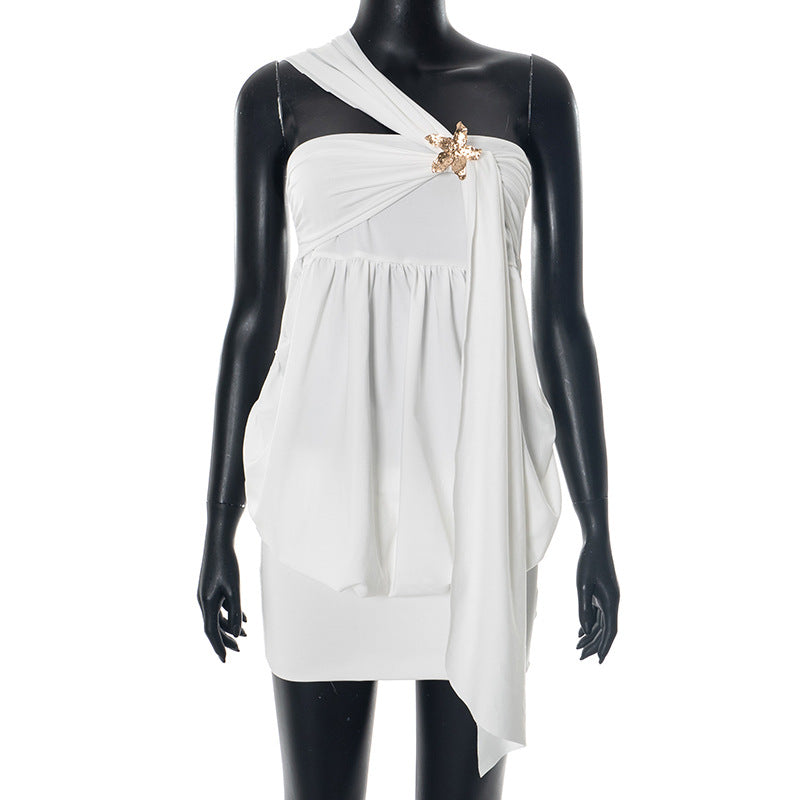 Women Clothing Summer Sexy Solid Color Oblique Shoulder Floral Chest Cover Hip Dress