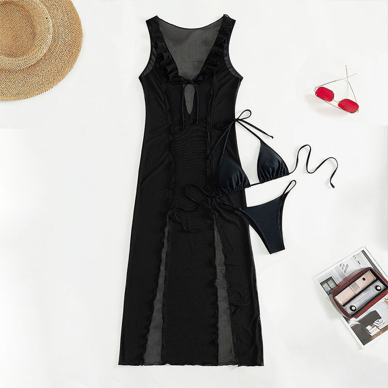 Maxi Dress Beachwear Bikini Strap Sun Protection Mesh Three Piece Swimsuit Women