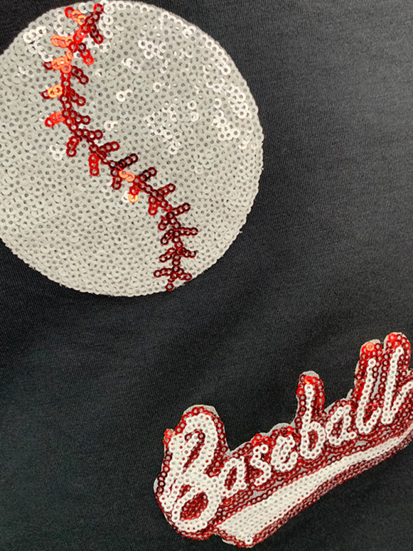 Modern English letters sequin embroidered knitted pullover short-sleeved top