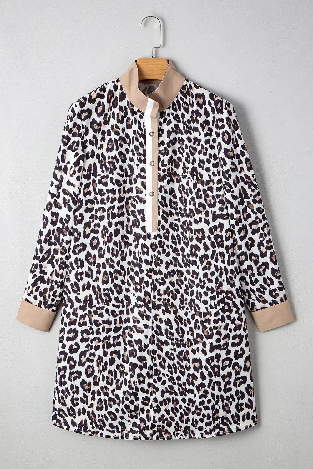 - This dress boasts a chic collar and buttons the front, adding a touch of sophistication to the playful leopard print and patchwork design.