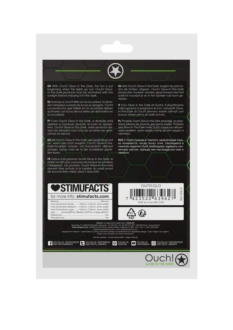 Light up your intimate moments with the Ouch! Glow in the Dark 2-Piece Silicone Cock Ring Set. Made from soft, body-safe silicone, these glow-in-the-dark rings provide a secure and comfortable fit designed to enhance stamina and sensation. Perfect for those who want to add a playful and adventurous touch to their experience, the stretchy material ensures durability and comfort during extended use. Easy to clean and maintain, this set brings both fun and functionality to your collection.