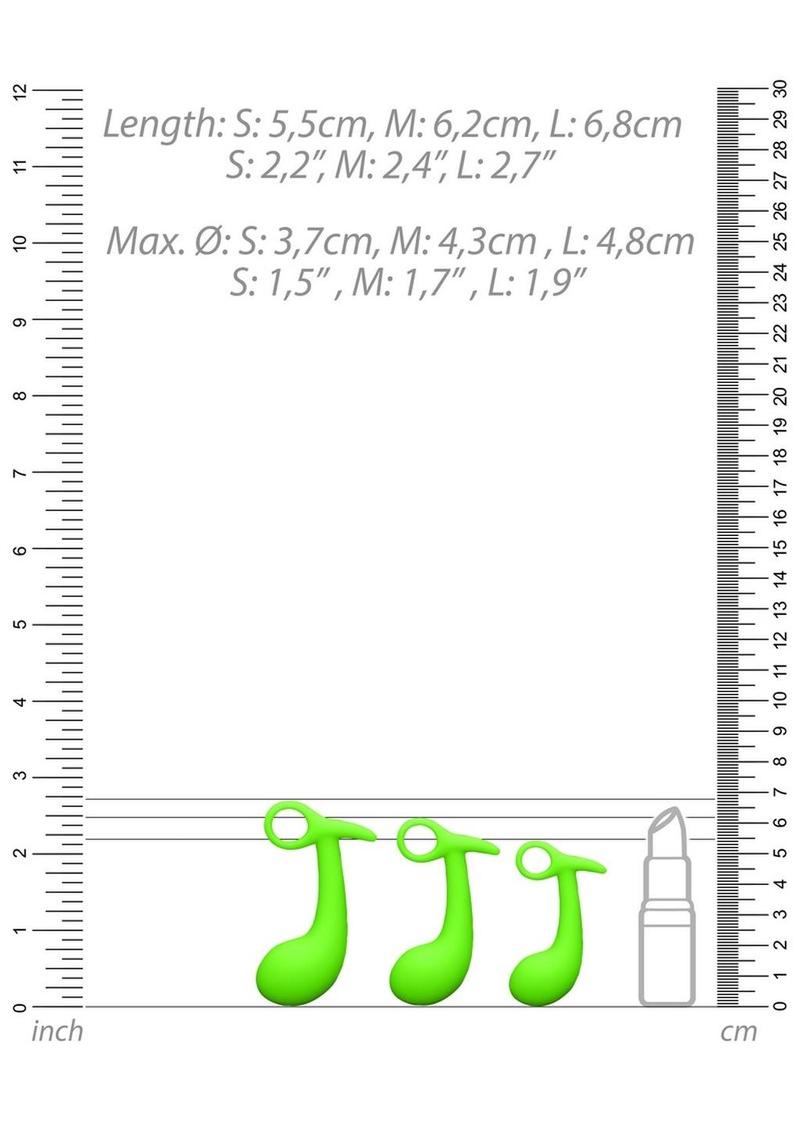 Experience the thrill of prostate play day and night with the Ouch! Glow in the Dark Prostate Kit. This 3-piece set includes three uniquely shaped anal plugs in varying sizes (3.9", 4.4", 5") that glow vibrant green in the dark for a fun and exciting experience. Crafted for comfort and safety, these plugs are perfect for beginners and advanced users alike.
