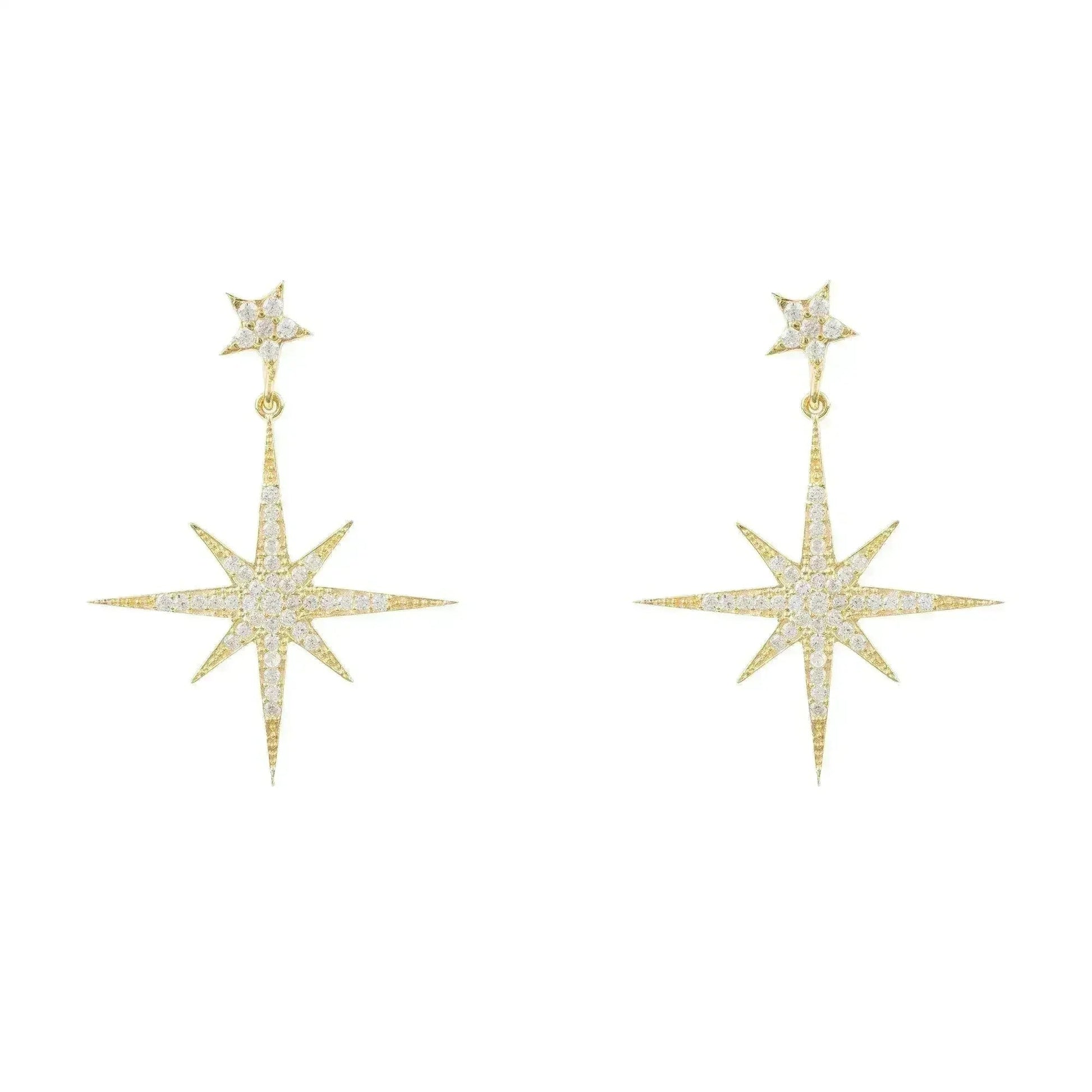 Capture celestial magic with the Petite Star Burst Drop Earrings. These dazzling earrings feature a double starburst design with handset micro pave AAA cubic zirconia, creating a supernova effect that adds glamorous sparkle to any outfit. Crafted in 22ct gold-dipped sterling silver, they offer luxurious brilliance for special moments and everyday elegance.