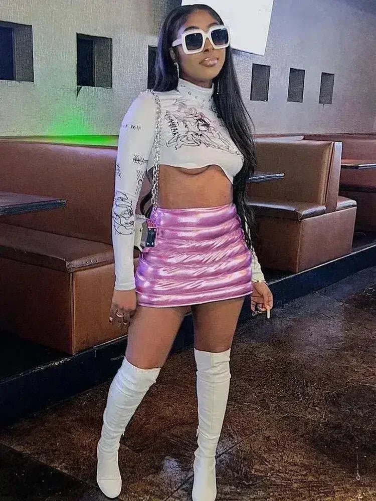 Pink Women's Puffer Skirt Metallic Shiny Warm Quilted Mini A-line