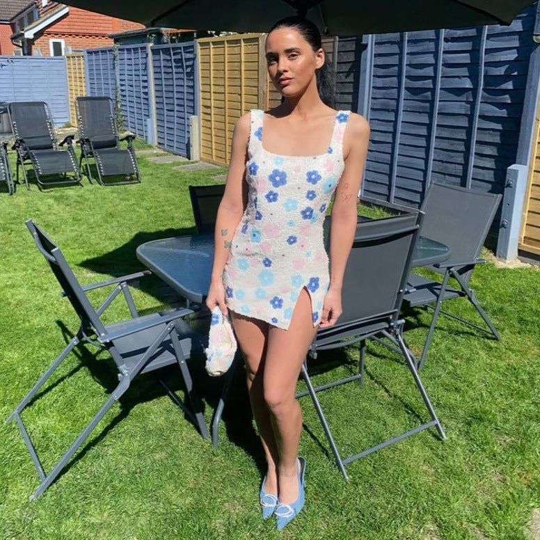 Spring Summer Colorful Floral Diamond Lattice Sequ Split Sheath Sexy Dress