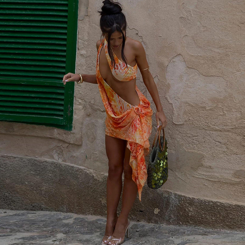 Spring Summer Women Clothing Sexy Oblique Shoulder Hollow Out Cutout Printing Color Contrast Backless Sheath Dress