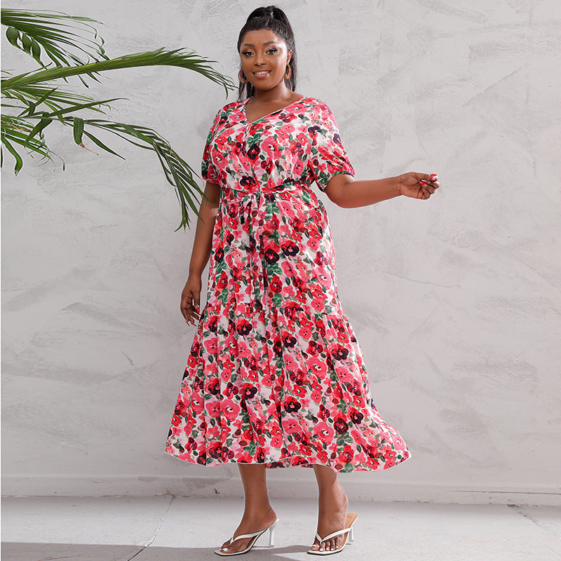 Super Fairy V neck Floral Print Dress Seaside Holiday Beach Loose Waist Long Dress