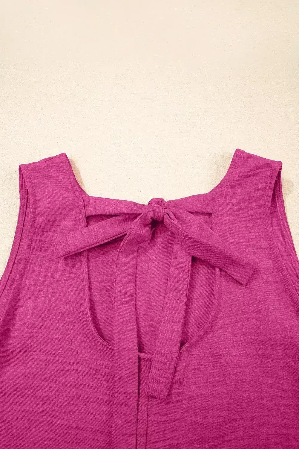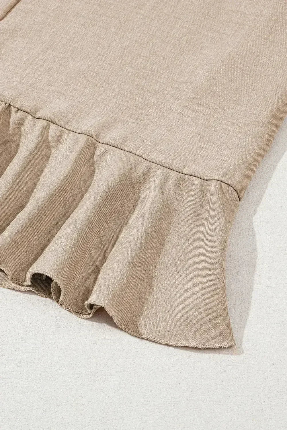 - Sleeveless with a ruffle hem, it offers a feminine, playful look for casual occasions.
