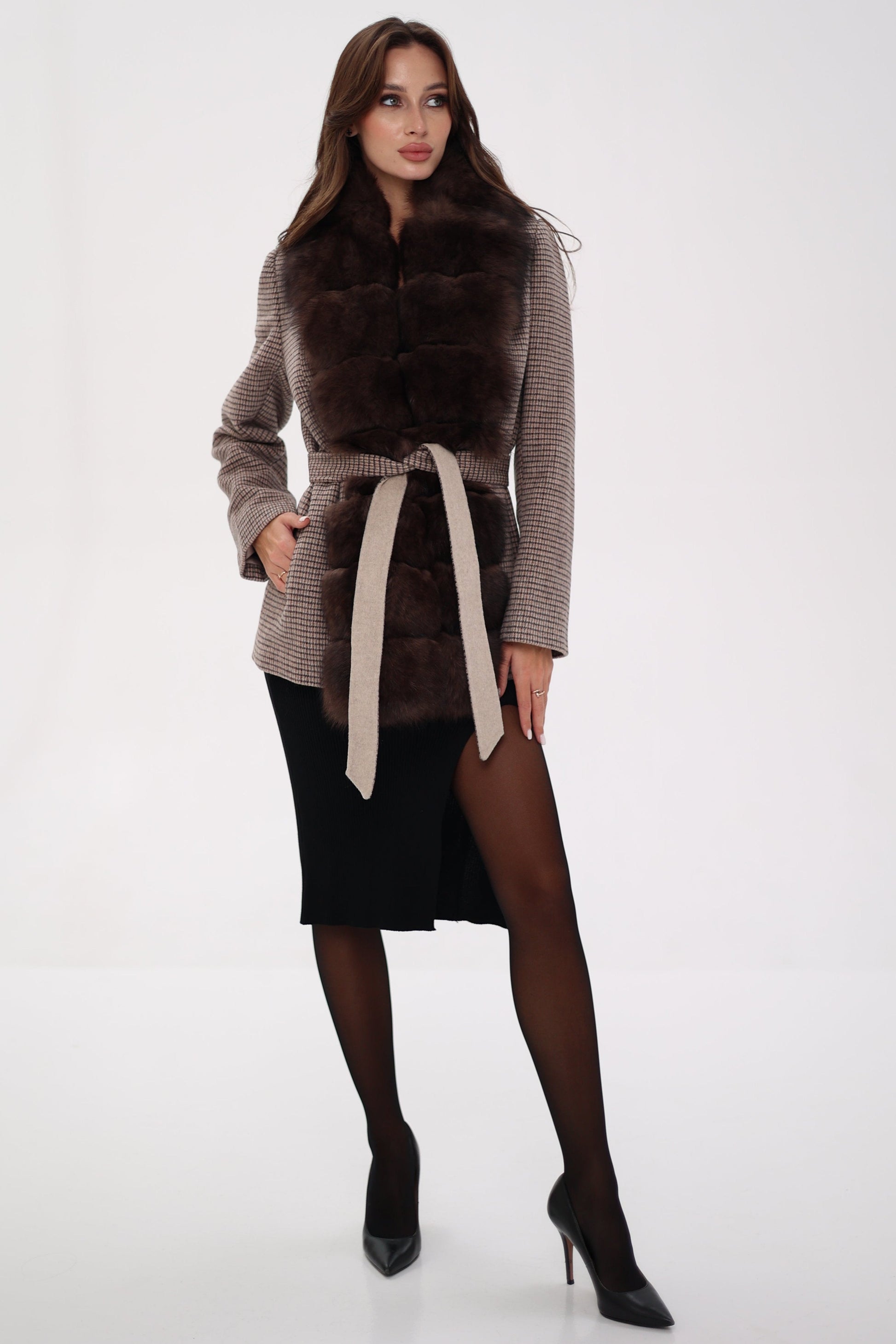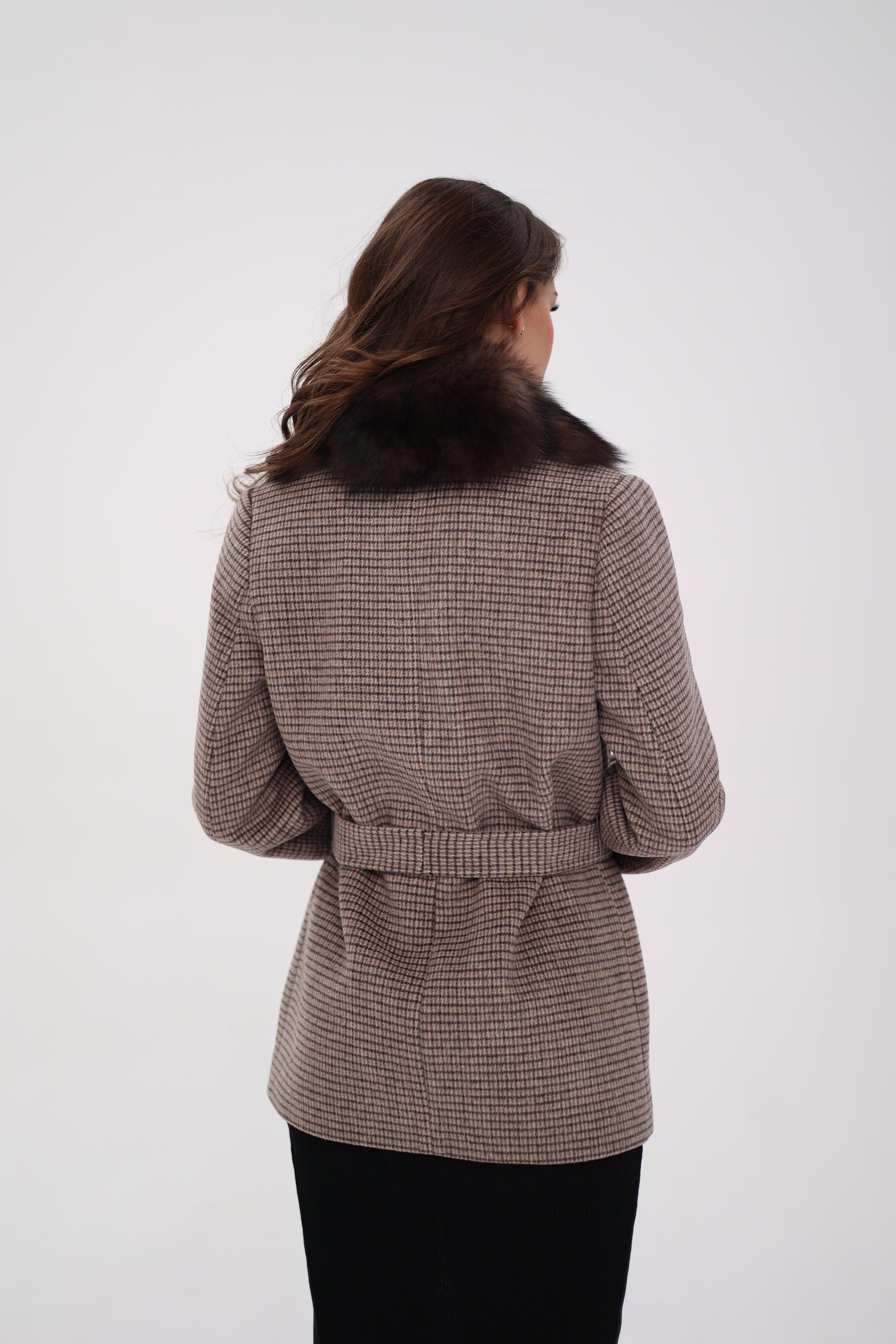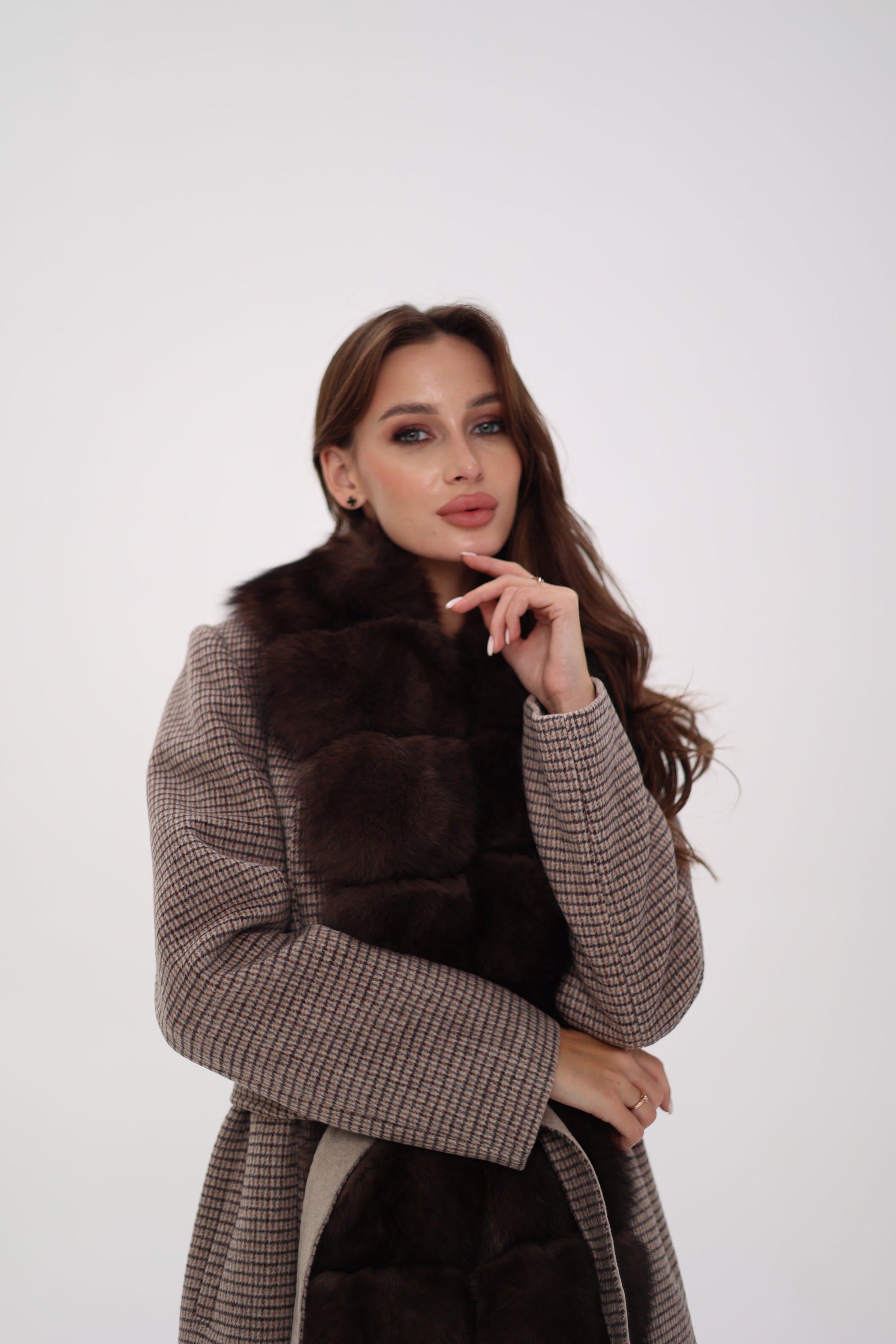 Manteau en véritable fourrure de renard polaire et laine vierge beige foncé