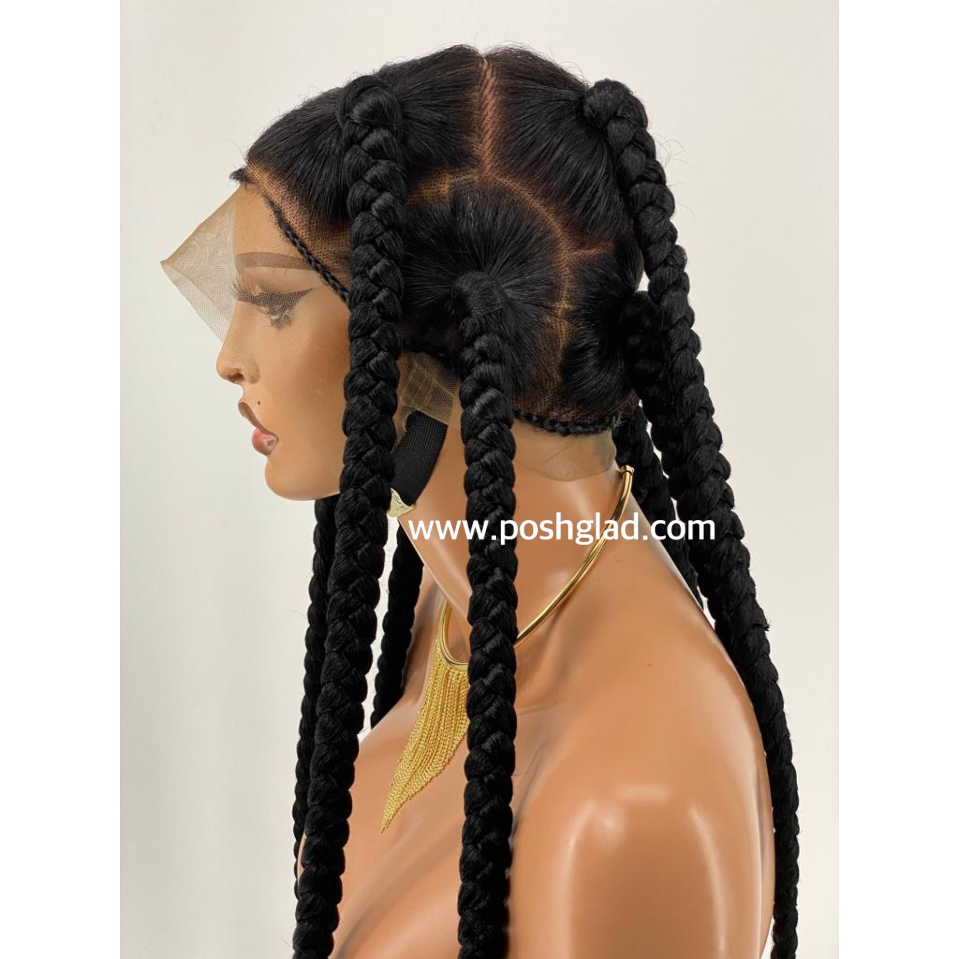 This is a natural-looking, Large jumbo knotless braided wig with a spiral tip. It is crafted from 100% human hair full lace base and premium quality hair extensions. Each unit, including all our full lace wigs, comes with four combs, an elastic band, and an adjustable strap to ensure a perfect fit. The color is color 1B and the length is waist length. We offer premium-quality wigs that mimic the appearance of a natural scalp, along with fast shipping and 24/7 customer support. Say goodbye to spending eight hours in a salon! With a Poshglad braided wig, you can put it on and go. Studies show that braiding your natural hair can lead to long-term issues such as alopecia, receding hairlines, baldness, and even hair-related cancers. With our wigs, you can wear styles without worrying about damaging your natural hair.