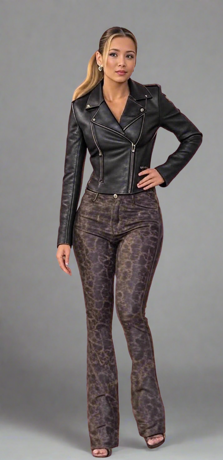 Make a statement with our MYSTIC jeans, featuring a bold and fashionable all-over leopard print. Designed to turn heads, these jeans offer a comfortable high waist and a dramatic flared leg, perfect for embracing a retro-inspired look with a modern twist. They feature a smooth waistband with no visible buttons, suggesting a pull-on style or a concealed closure.