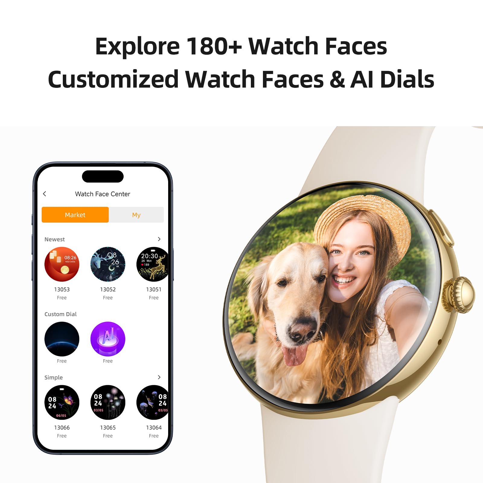 Connecté : Appels Bluetooth 5.3, notifications d'applications (Facebook, WhatsApp, TikTok). Assistant vocal AI. Compatible iPhone/Android.