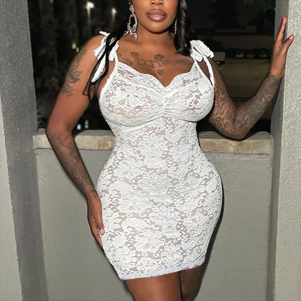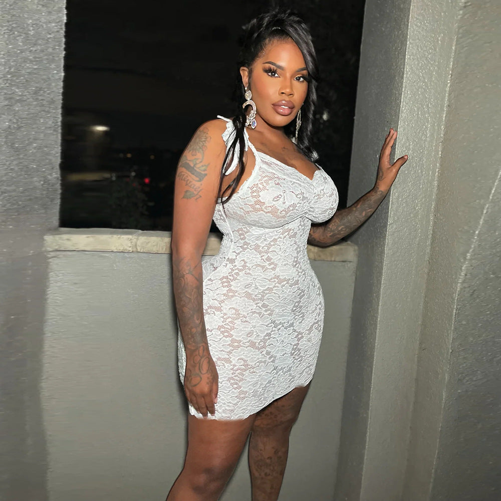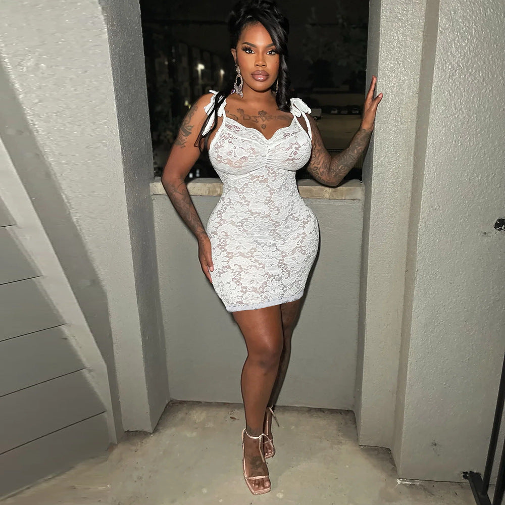 Sexy Women Clothing See through Slim Fit Lace up Sling Floral Lace Sheath Dress