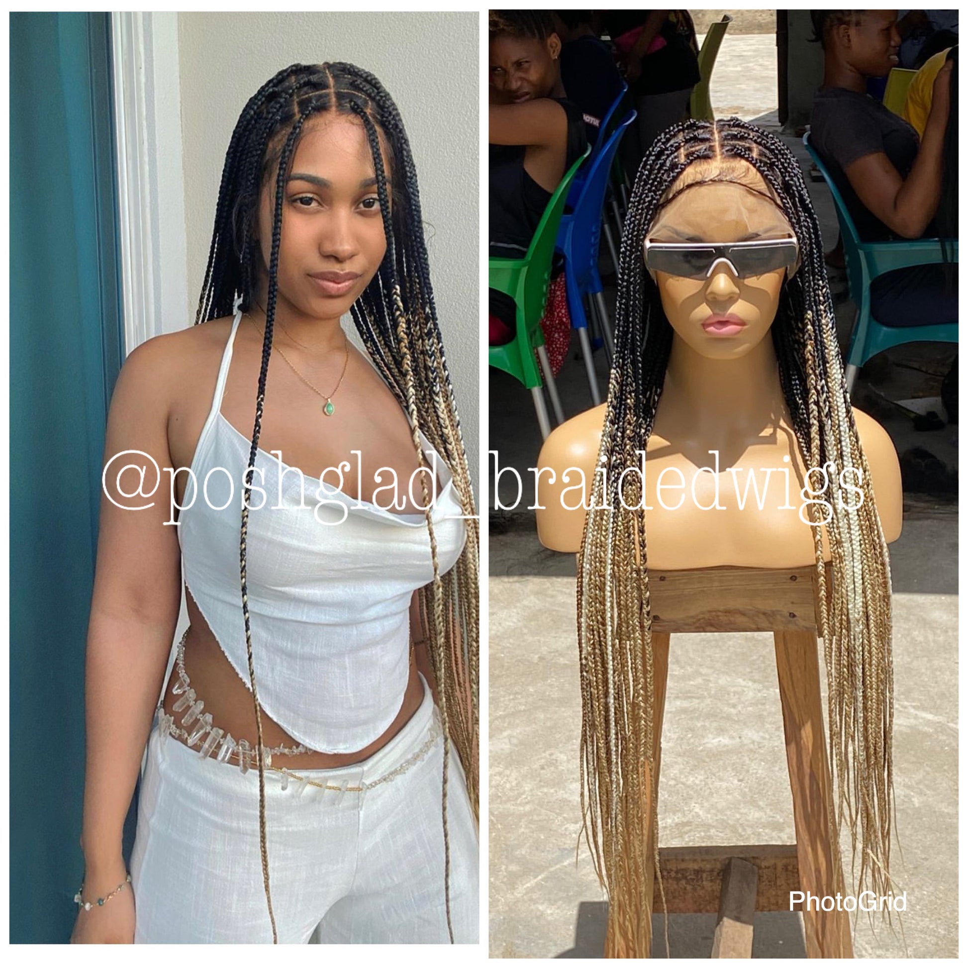 This scalp-looking glueless shade knotless wig has 100% human hair up to "8-12", a stretchable medium brown Swiss full lace cap, and a fine blend of quality kanekalon fiber for extra length. It has 3-4 combs inside, an adjustable rubber band, baby hair, and a snap hook for secured installation. The hair root is 1B, the hair color is Ombre, the length is shoulder length, and the weight is approximately 70 grams. It can last for up to 2-3 years if properly maintained. Studies show that braiding your natural hair or using harsh shampoo for an extended period causes long-term alopecia, baldness, and unbearable pain. With a poshglad braided wig, you don't have to worry about any of that. Just put your wig on and go—nobody will know it's a wig.