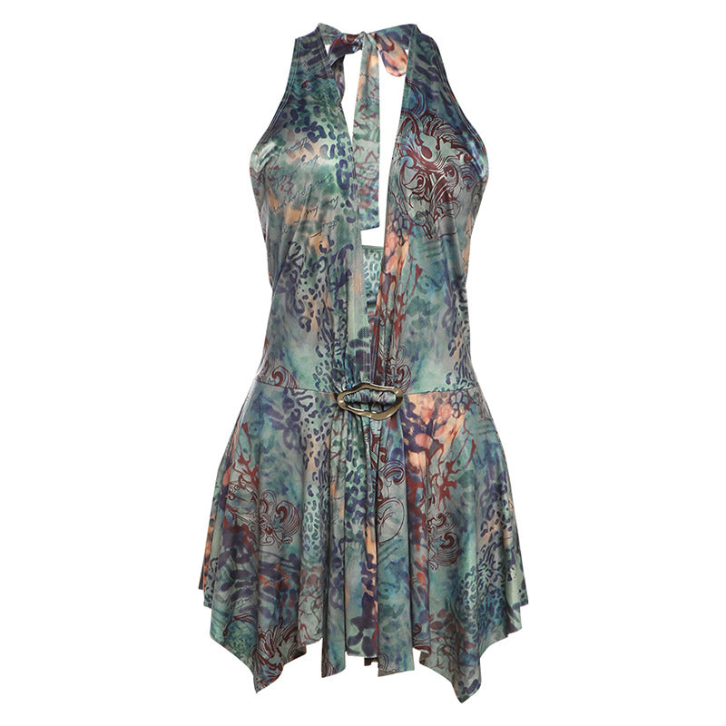 Summer Women Clothing Fashionable Elegant Sexy Halter Lace up Backless Slim Fit Printing Dress