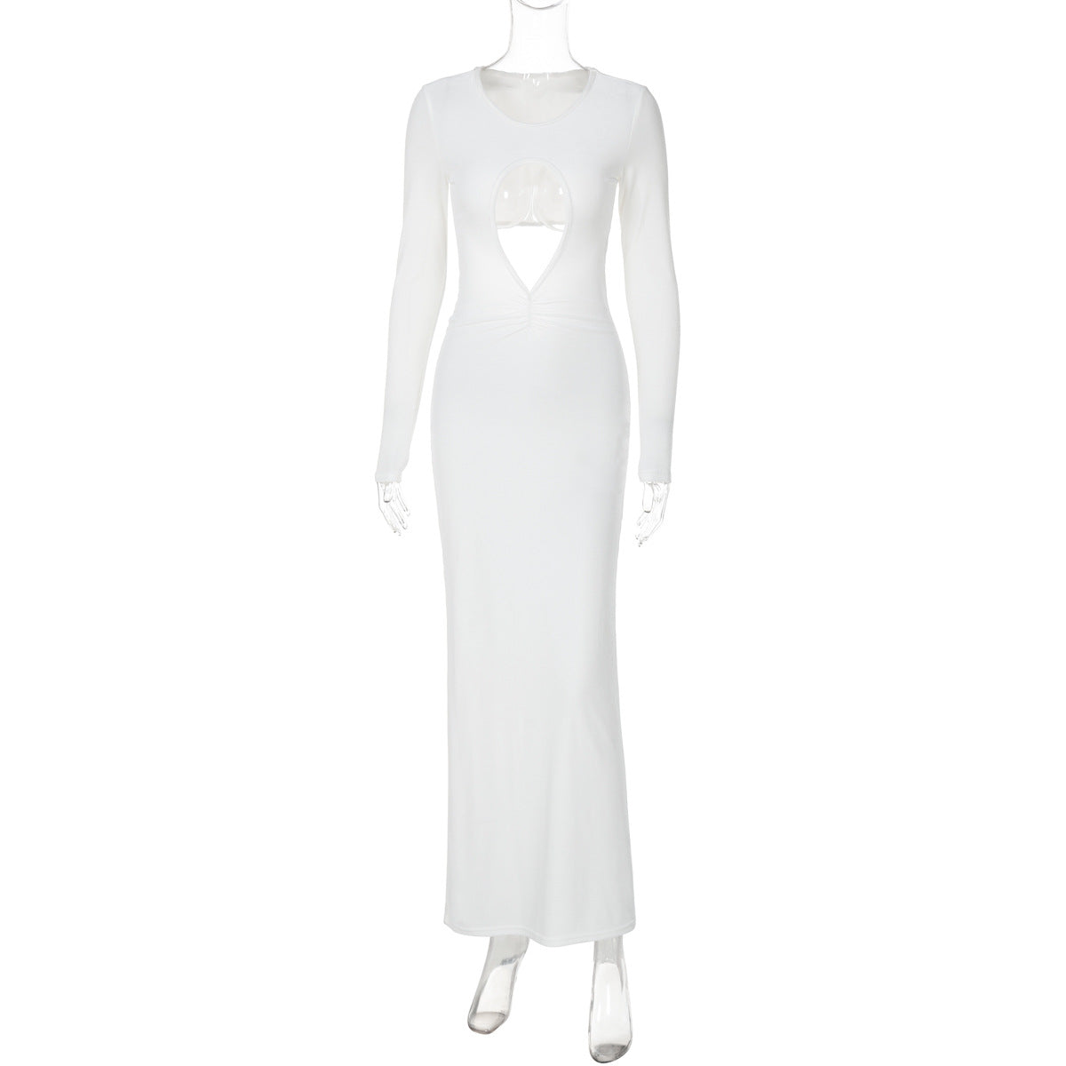 Women Clothing Autumn Sexy Cutout Slim Pleated Solid Color Long Sleeve Dress