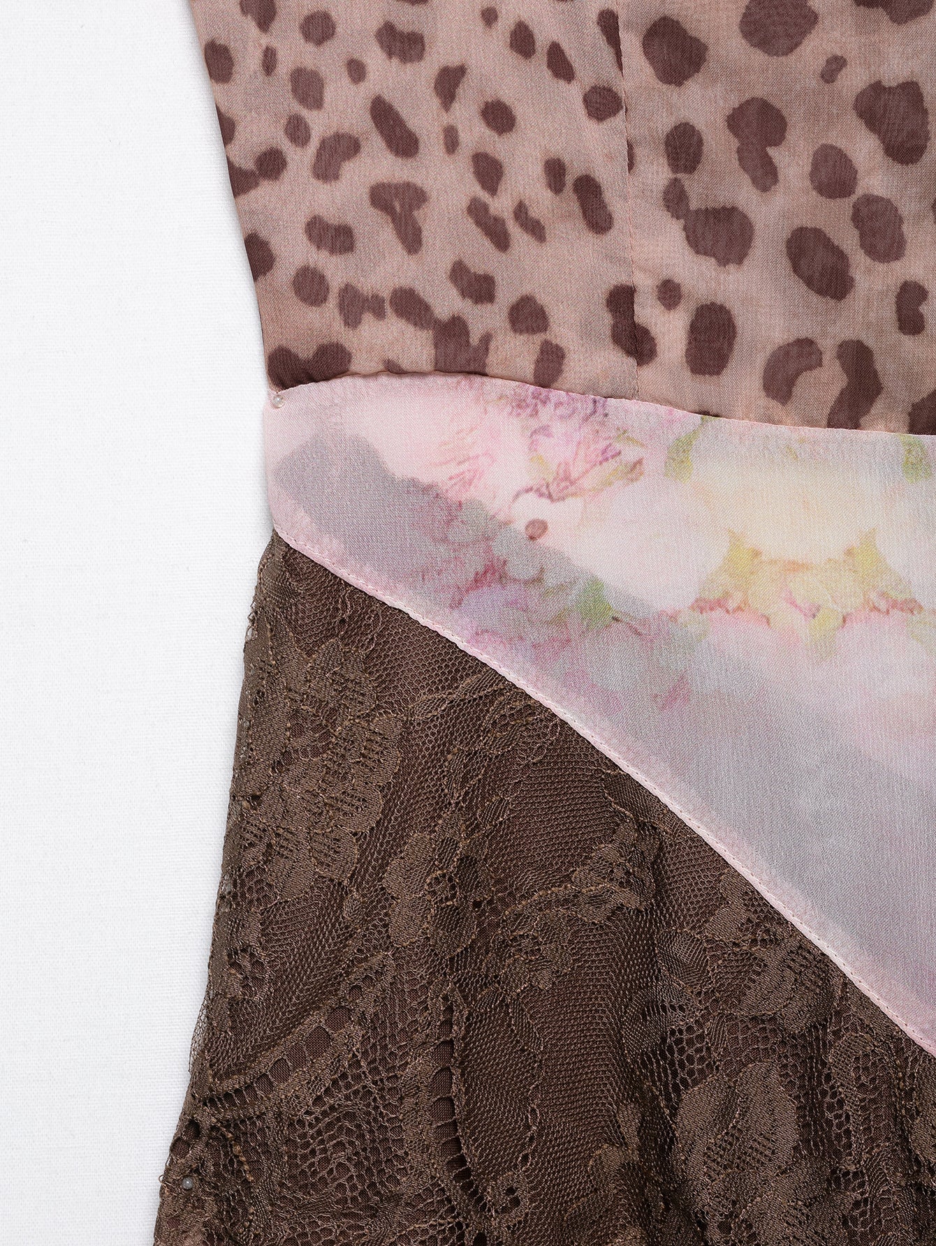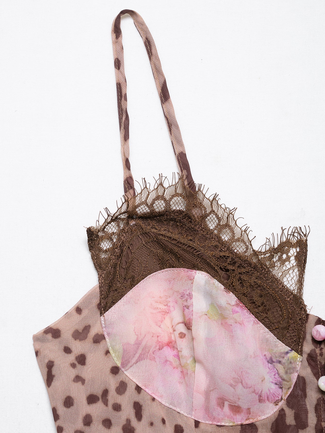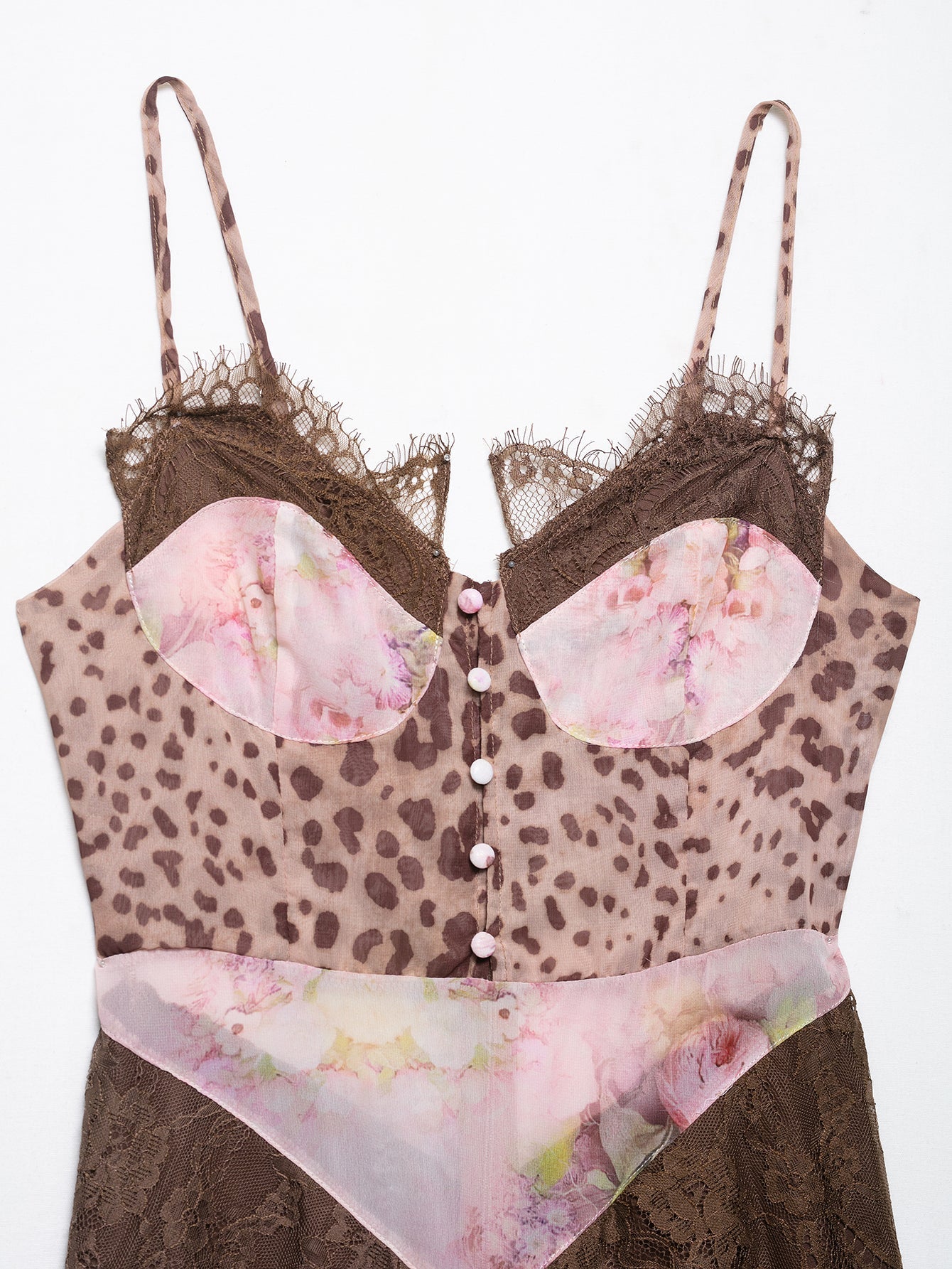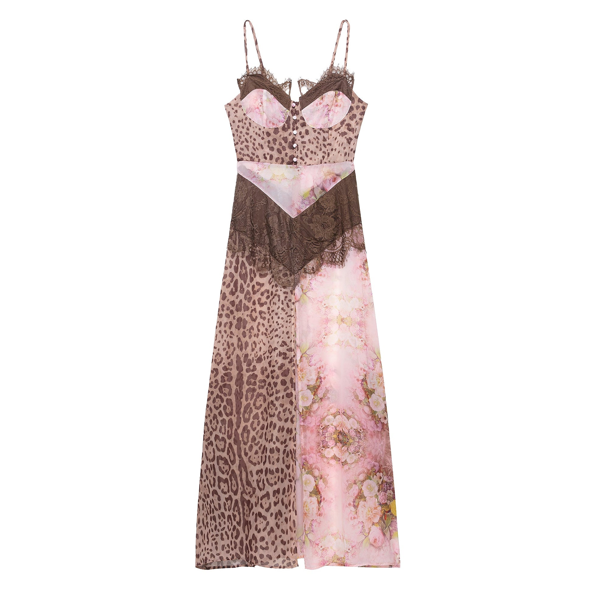 Women Clothing Color Contrast Printed Lace Slim Fit Patchwork Split Sling Dress