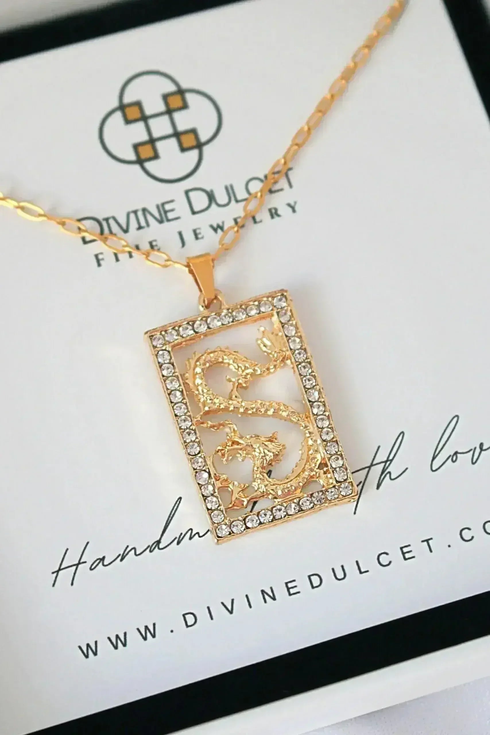 Chinese dragon necklace with clear cubic zirconia in diamond cut inlay, perfect to pair with more necklaces and beautifully layered shapes.