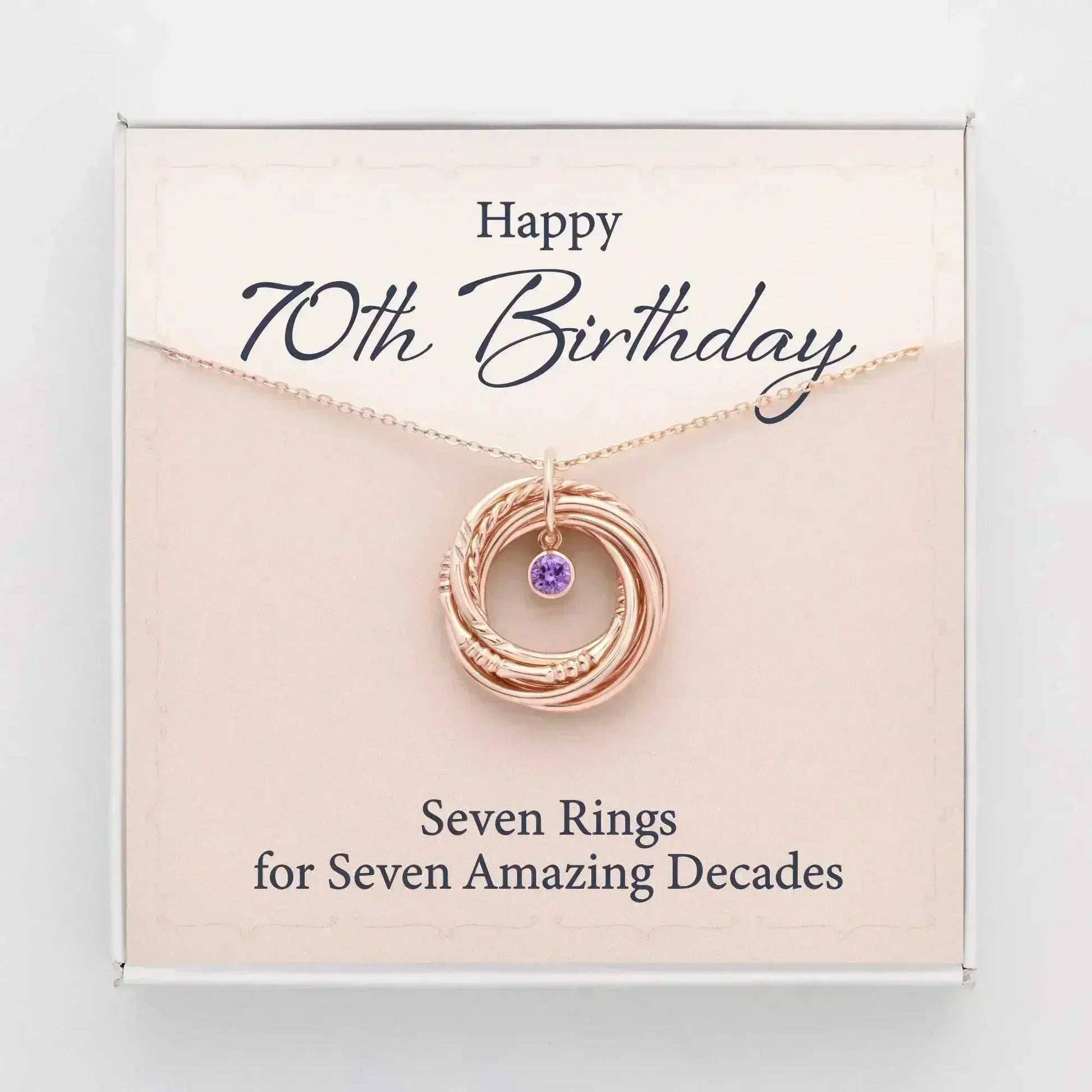 This necklace is a perfect gift for that very special 60th birthday. Each of the silver rings representing and celebrating each decade. Along with birthstones of your choice, this eternity necklace is a great gift for Mother's Day or any special occasion.