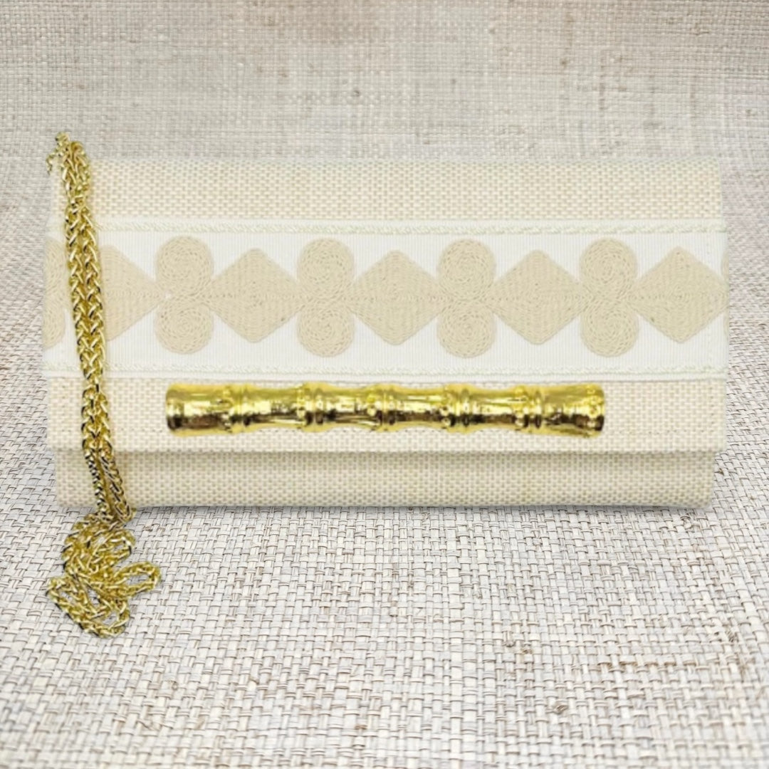 This clutch is made from a beautiful, textured Thibaut grasscloth and features an embroidered tape across the front. The inside of the clutch is lined with white linen, and contains accordion sides with grommets for a removable chain (included). Click the "Customize Your Bag" button below to see decorative hardware options, and choose your favorite! Overall dimensions are 10” x 5” with a magnetic snap closure.