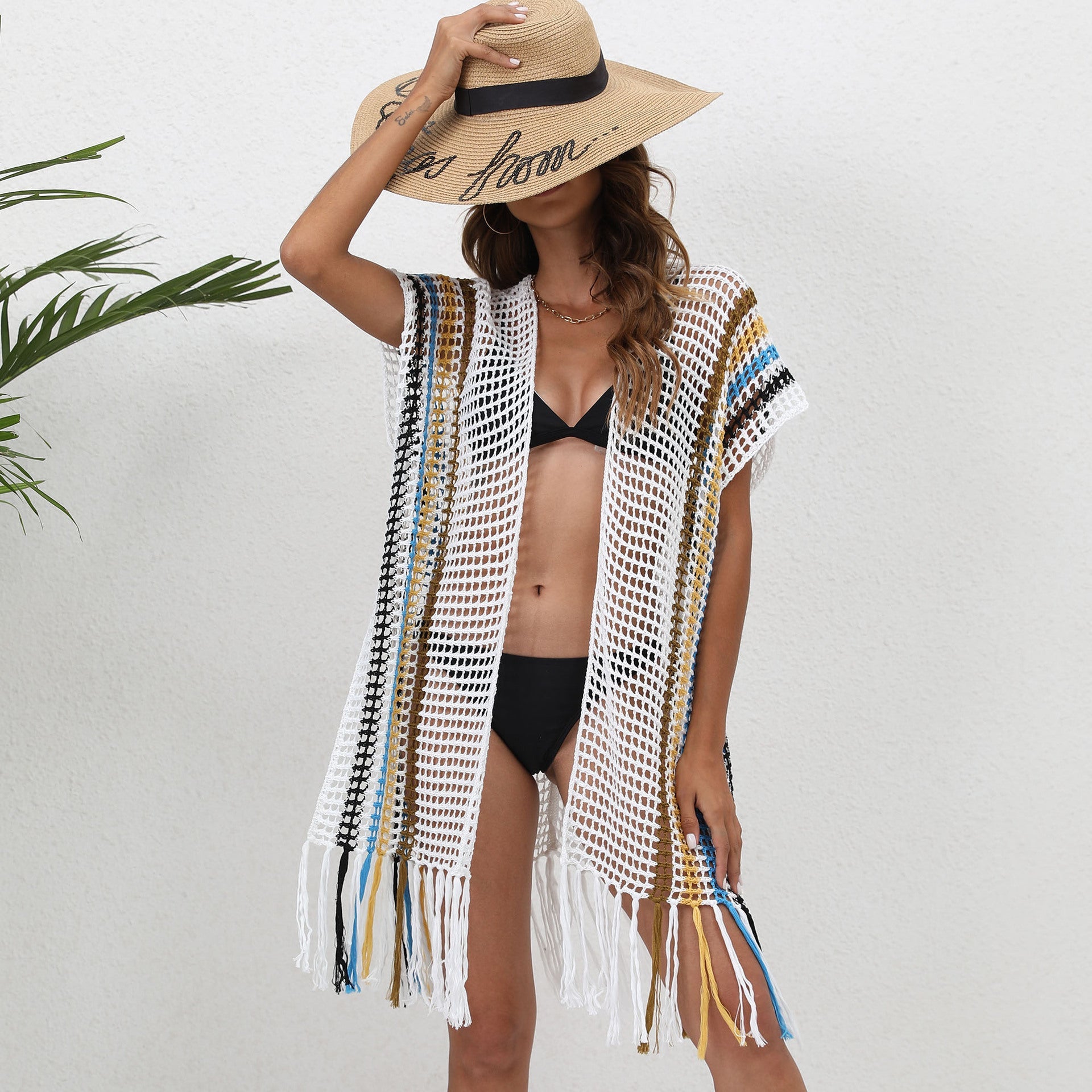 Beach Cover up Women Clothing Loose Woven Shirt Color Contrast Patchwork Tassel Beach Cover Up Cardigan