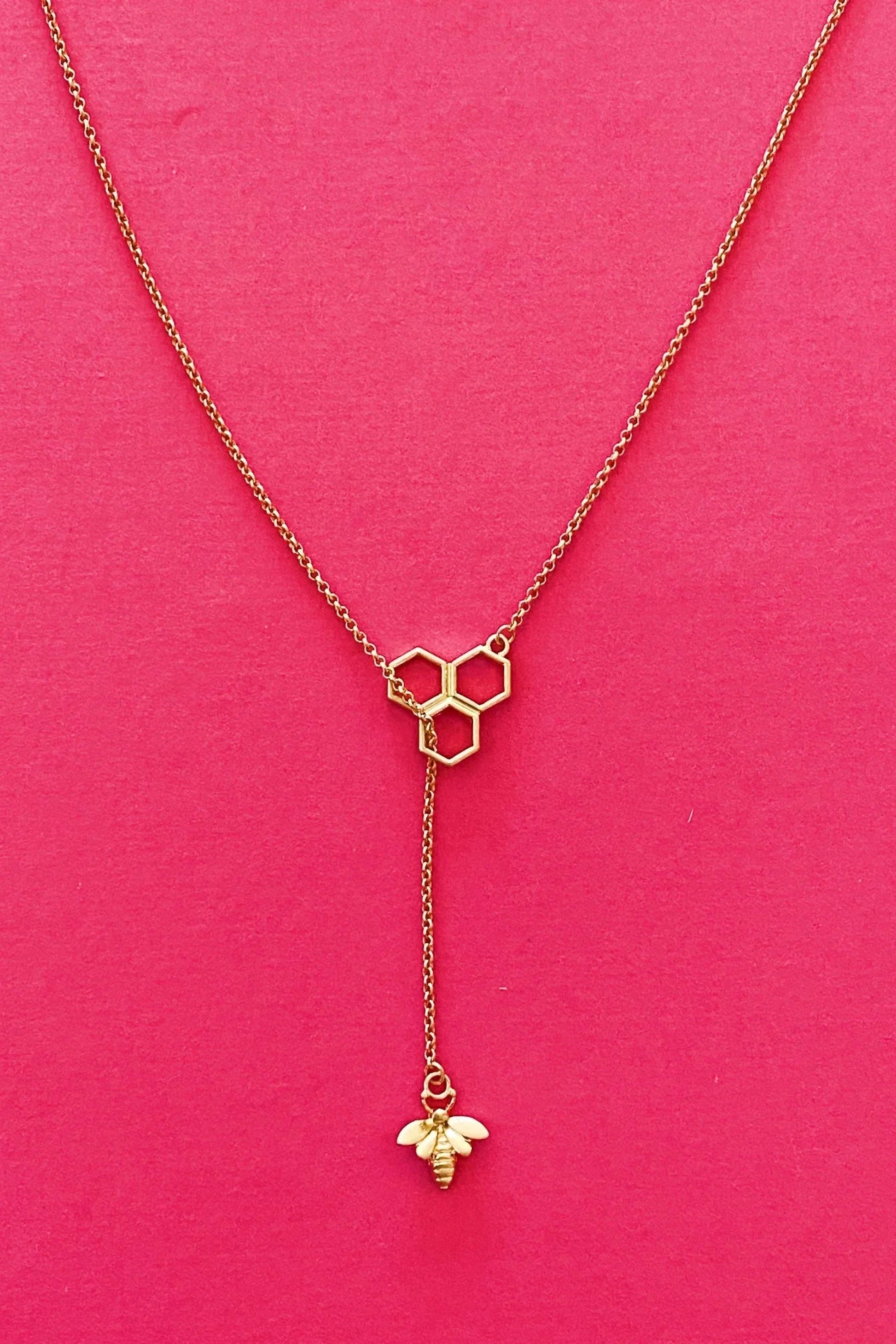 Bee hive with little bumble bee chain necklace. 21 inch total length(adjustable in front) with 3 inch extender in the back.