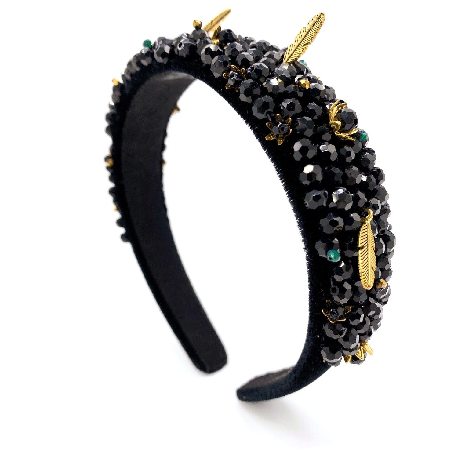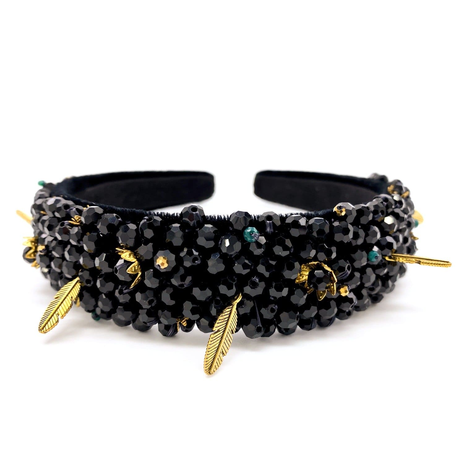 Adorn your head with this glam piece of heavily black beaded headband with gold Embellishments and details. Hand sewn with black and green crystals with gold leaves.