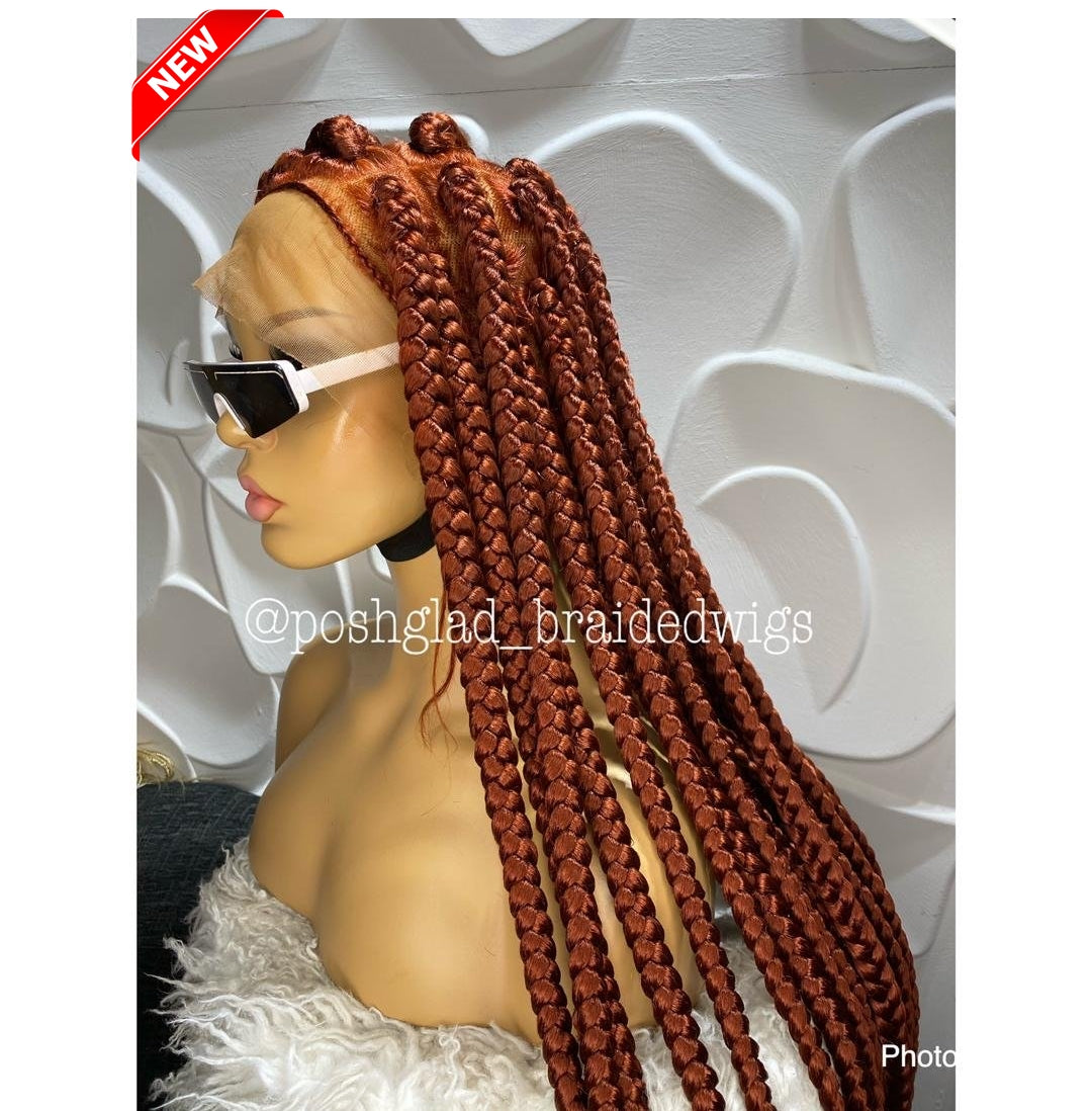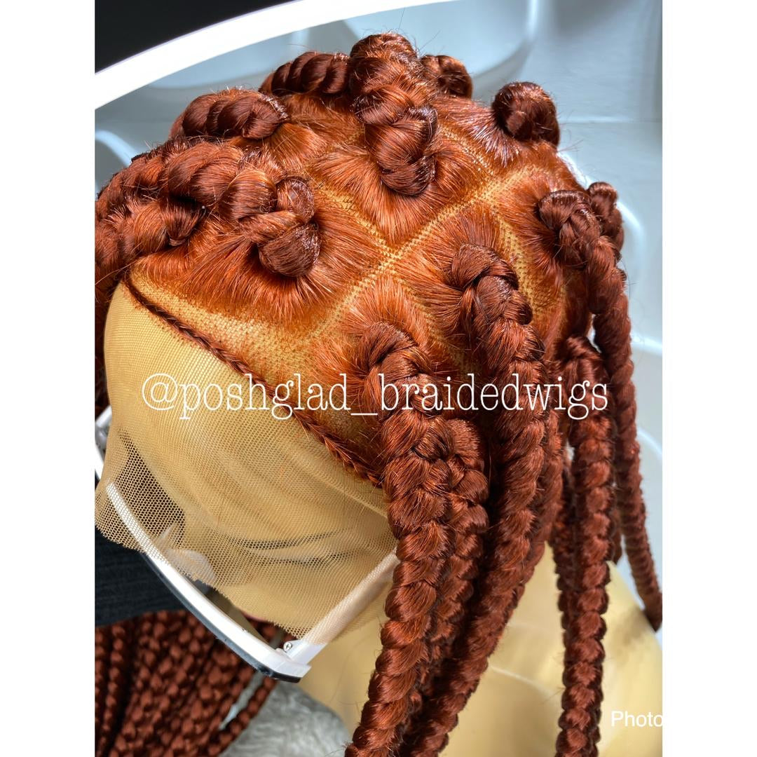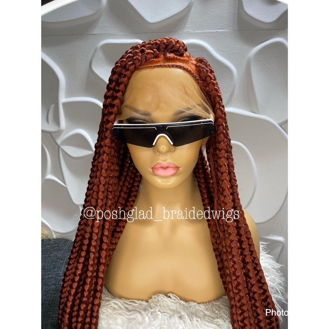 This style of Kemi jumbo box braid wig in COPPER RED is made with 100% FULL LACE with baby hair. It is neatly and tightly done for a long lasting use.. No more sitting down for 12 hours in a salon, like gurrrl No. Get your wig on and go. Study shows that braiding on your natural hair causes long term alopecia, an unbearable pain and that Ostrich neck after sitting down for 12 hours lol. With poshglad braided wig, just put your wig on and go, no time to waste.