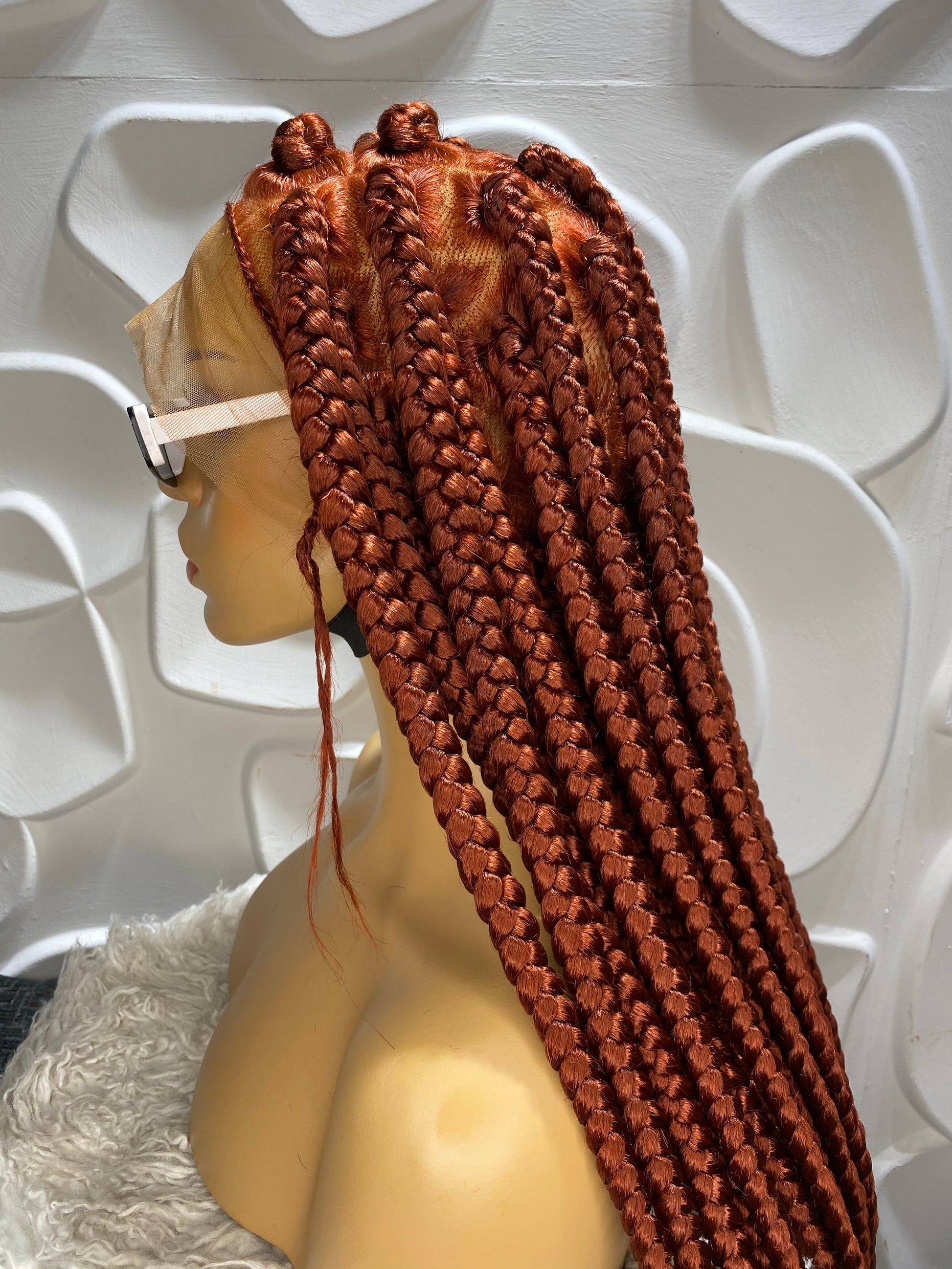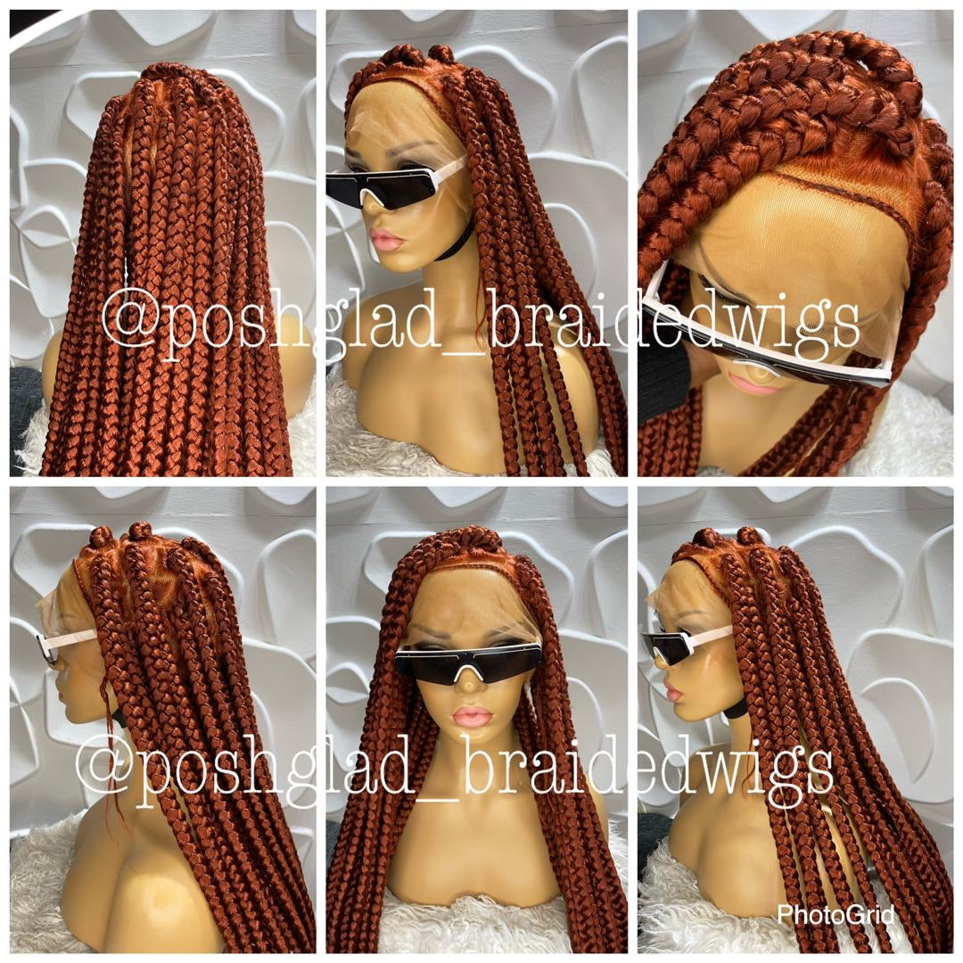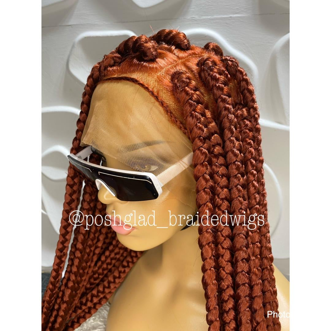This style of Kemi jumbo box braid wig in COPPER RED is made with 100% FULL LACE with baby hair. It is neatly and tightly done for a long lasting use.. No more sitting down for 12 hours in a salon, like gurrrl No. Get your wig on and go. Study shows that braiding on your natural hair causes long term alopecia, an unbearable pain and that Ostrich neck after sitting down for 12 hours lol. With poshglad braided wig, just put your wig on and go, no time to waste.
