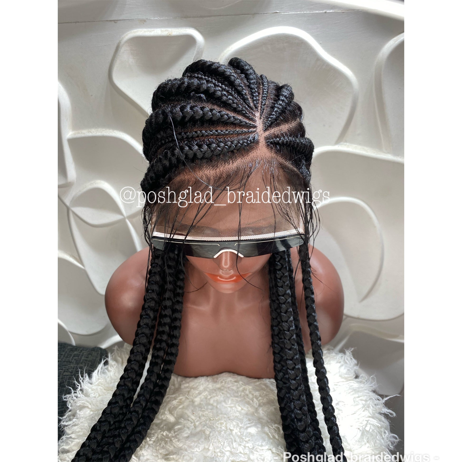 This natural looking custom handmade glueless cornrow braided wig name - Bolu is made with 100% human hair, Swiss full lace & the best kanekalon premium fiber for extra length. This unit and all our full lace wig come with 4 combs, an elastic band and an adjustable strap-on to hold it perfectly in place. We offer premium quality wig that look like a scalp, free shipping and 24/7 customer support. No more sitting down in a salon for 8 hours, like gurrrl no! - get your poshglad braided wig, wear it and go. Study shows that braiding on your natural hair causes long term alopecia, receding hairline, baldness and long term hair cancer. With our wigs you don't have to worry about losing your natural hair.