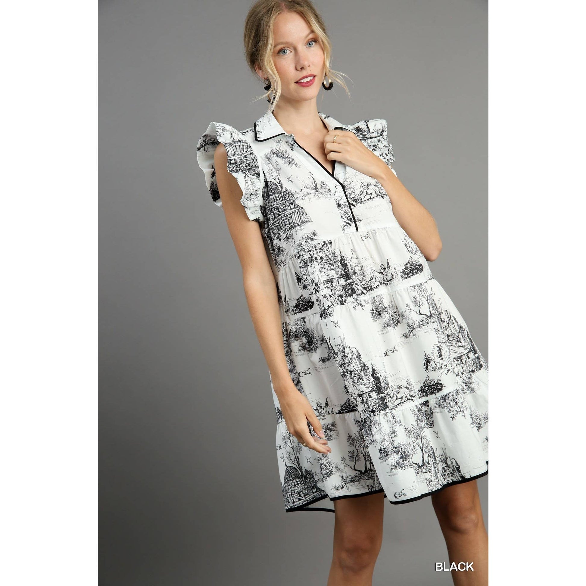 Feel like a breath of fresh air in this whimsical two-tone landscape print mini dress! With delicate ruffle sleeves and charming contrast piping, this dress is all about effortless style and grace. Made from 100% cotton, it’s lightweight and perfect for those warm, sunny days. The flattering silhouette makes it ideal for brunch dates, garden parties, or just twirling around feeling fabulous!