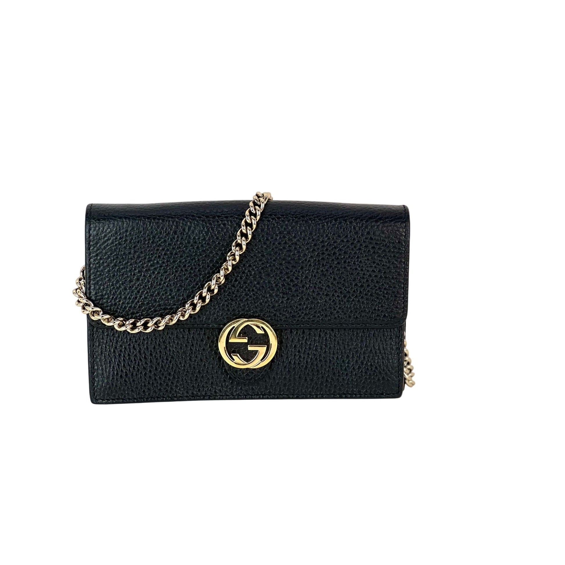 Gucci Interlocking Black Leather Dollar Calfskin GG Wallet on a Chain Clutch Bag