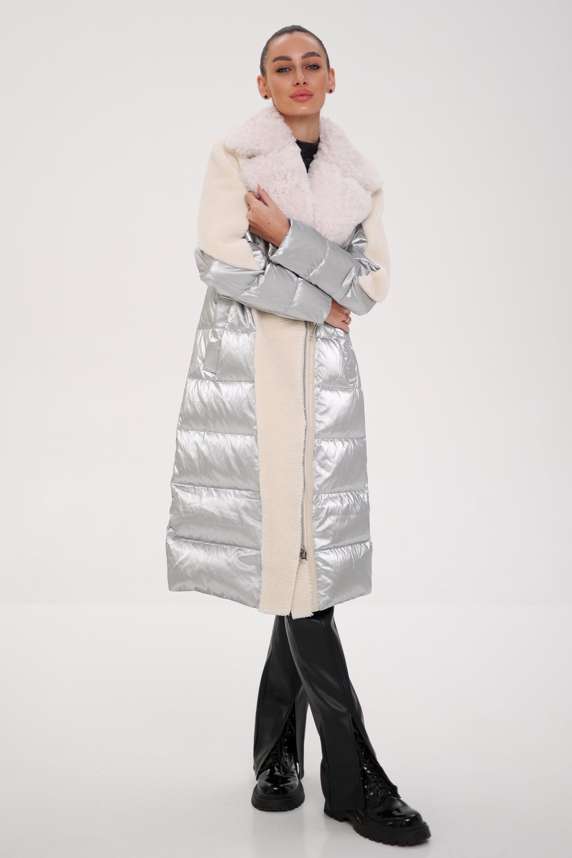High performance and high fashion combine on this water-resistant nylon coat lavishly trimmed with curly lama fur collar. Part of Alaska`s capsule collection, which focuses on contrasting textiles and textures, this piece uses a mix of luxe materials for a modern take on winter coat. Refined, elegant and modern: mid length fusion coat features a performance blend with a delicate satin sheen, making it a head-turner for the winter.