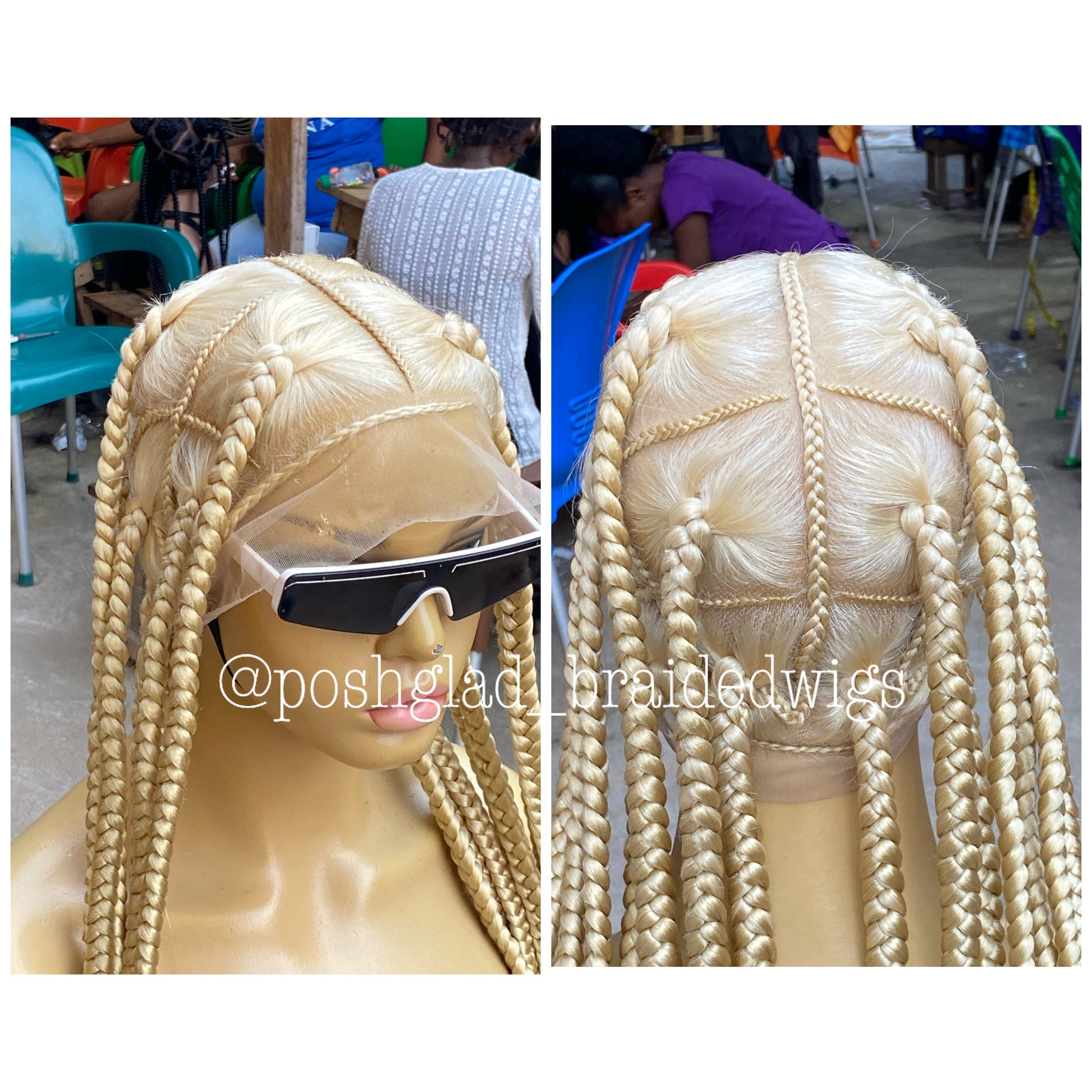 This natural looking custom handmade glueless large jumbo knotless braided wig name - Taylor is made with 100% human hair, HD full lace and the best kanekalon premium fiber for extra length. This unit and all our full lace wig come with 4 combs, an elastic band and an adjustable strap-on to hold it perfectly in place. We offer premium quality wig that look like a scalp, free shipping and 24/7 customer support. No more sitting down in a salon for 8 hours, like gurrrl no! - get your poshglad braided wig, wear it and go. Study shows that braiding on your natural hair causes long term alopecia, receding hairline, baldness and long term hair cancer. With our wigs you don't have to worry about losing your natural hair.