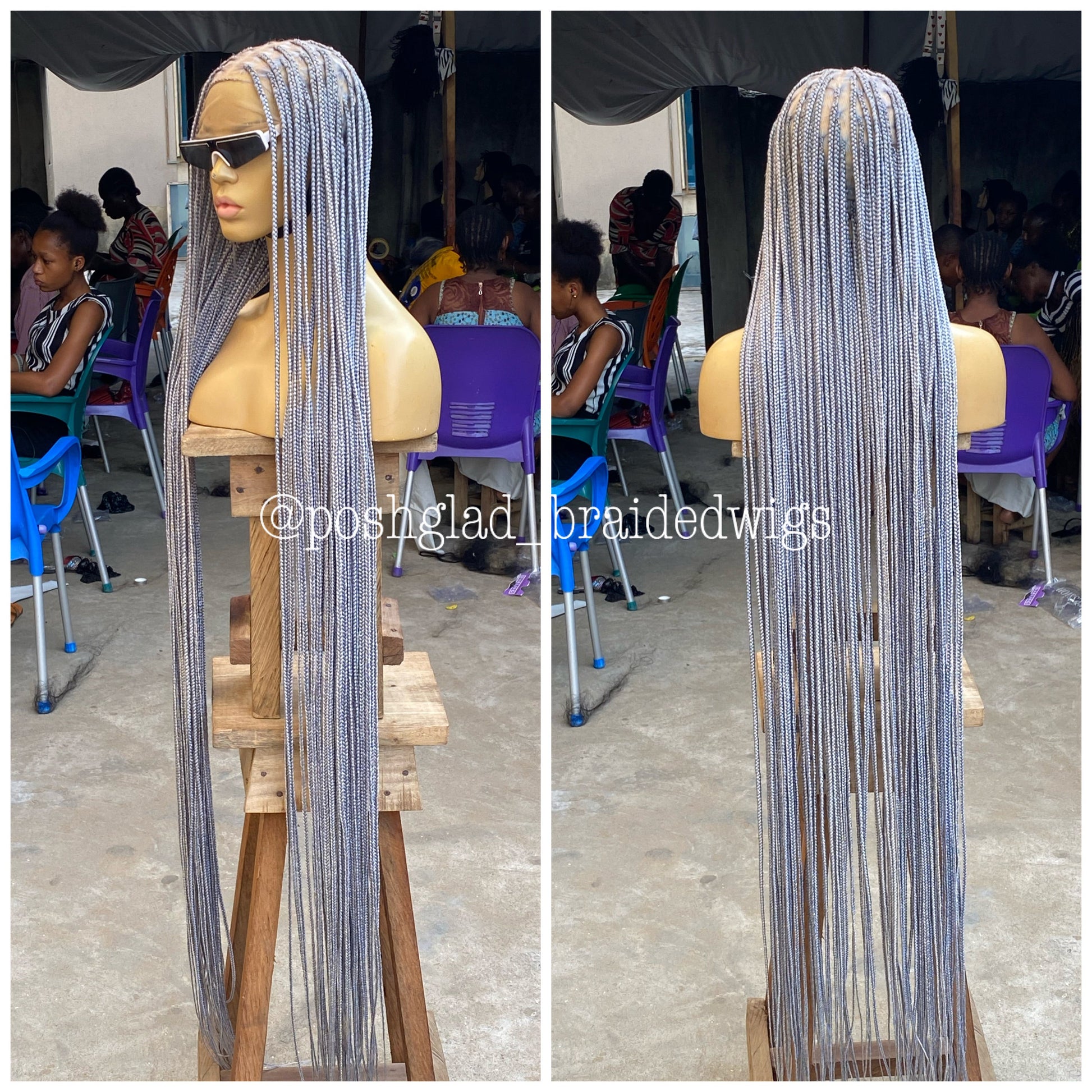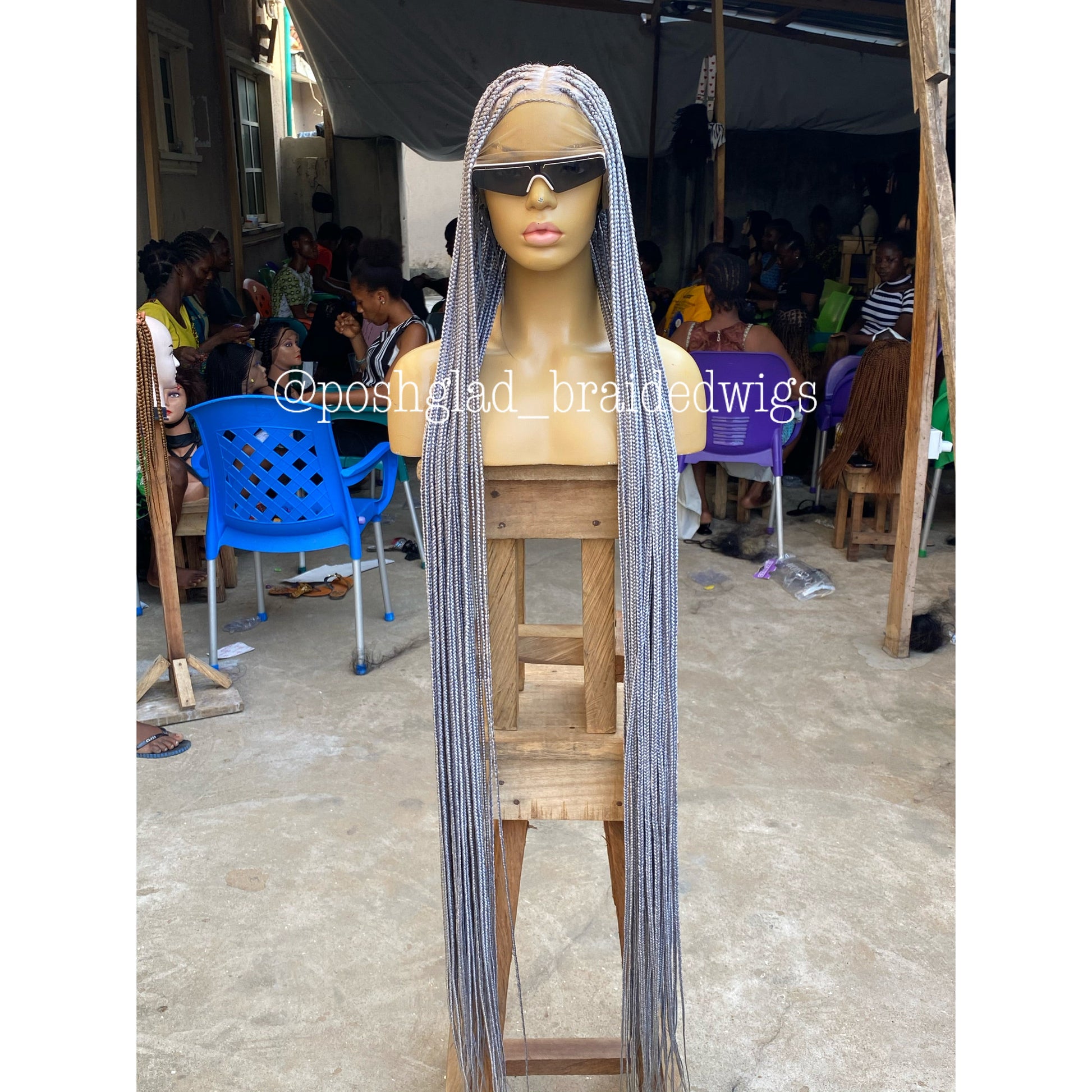 Knotless Braided Wig, Swiss Full Lace, Gray Color, Waist Length, Standard Density - Shawna