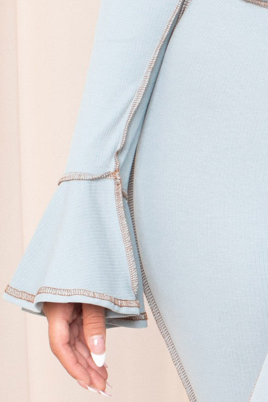 Effortlessly chic and cozy, the Maddie Set features a matching ribbed crop top and skinny pants with unique inside-out stitch detailing. The wide round neck and lace-down front bell long sleeves add a stylish twist to this comfortable two-piece.