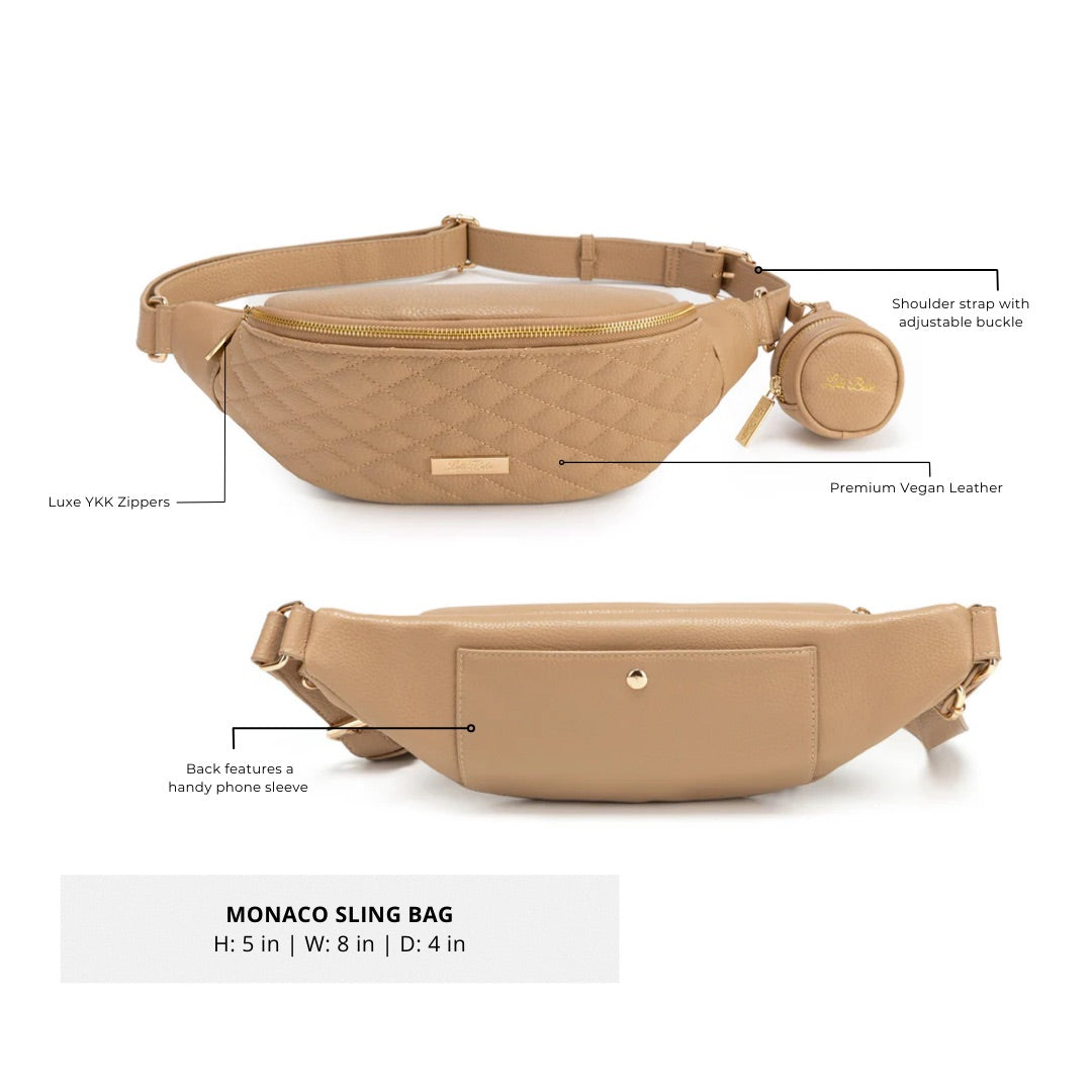 Wear it crossbody or slung over one shoulder, the adjustable strap ensures all-day comfort while keeping your essentials close. With dedicated pockets for your phone, wipes, and pacifiers, plus room for a bottle or snack, the Monaco Sling makes every errand, walk, or coffee run feel effortlessly put-together.