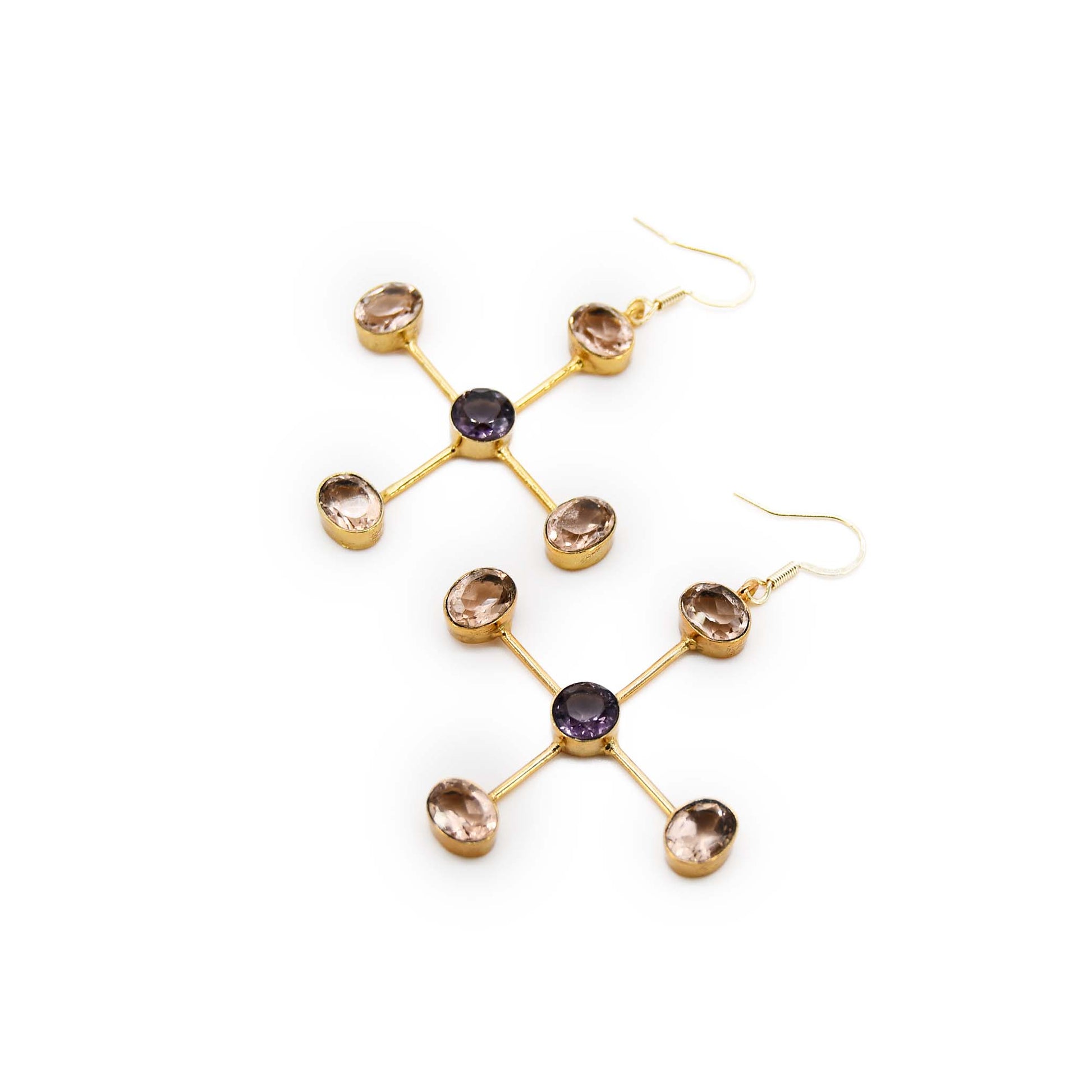 Ruth Earring handmade with 22k Gold plated earring featuring Amethyst and Morganite quartz stones.