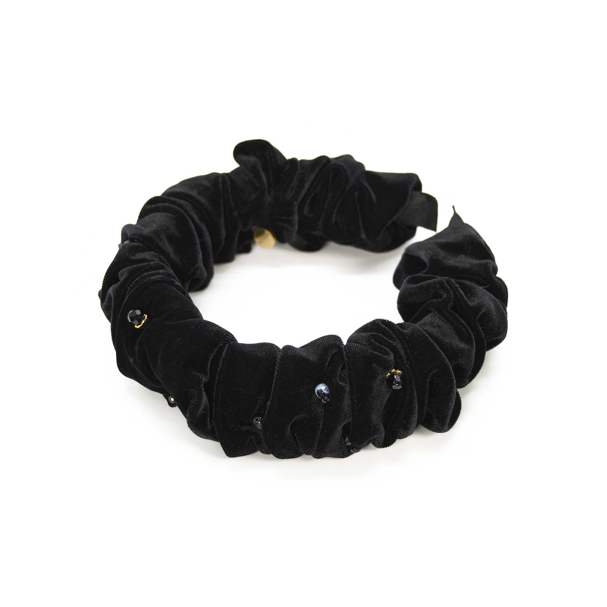 Adorne your head with this beautiful handmade Salvia Headband for this season. Hand sewn of Blue Firestone precious stones, black crystals and gold details. This headband is made of pleated velvet material and slightly chunky style to stand out.