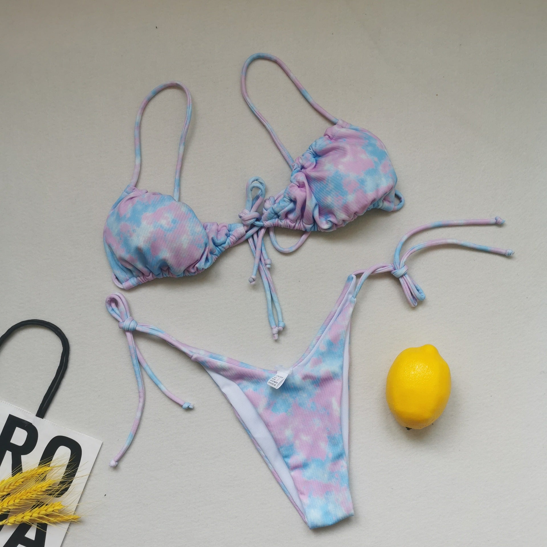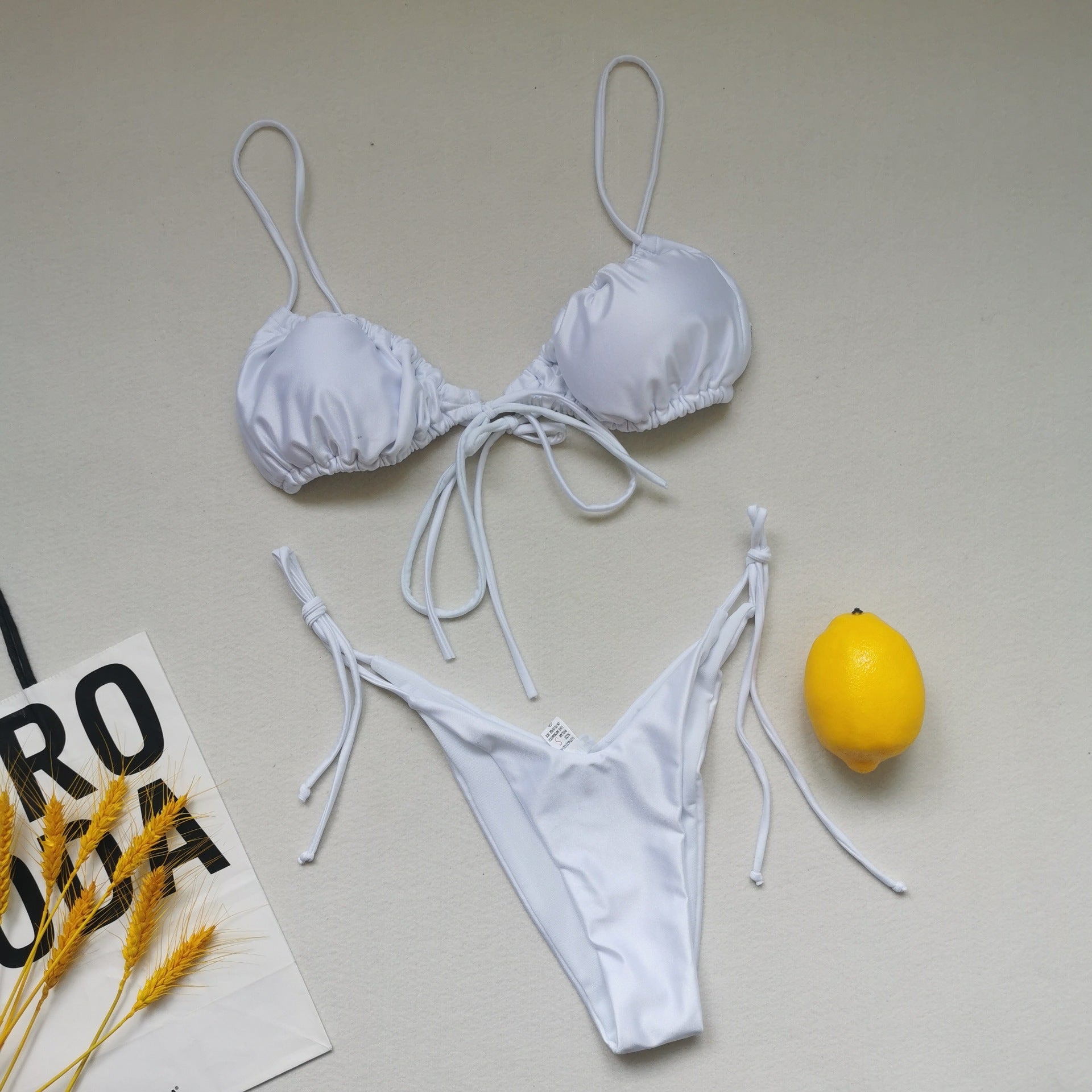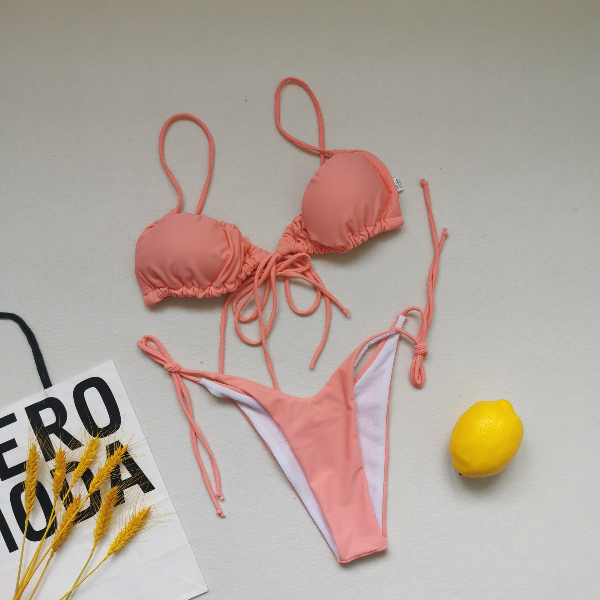Sling Bandage Swimsuit Women Pleated Push up Drawstring Sexy Solid Color Bikini Swimsuit