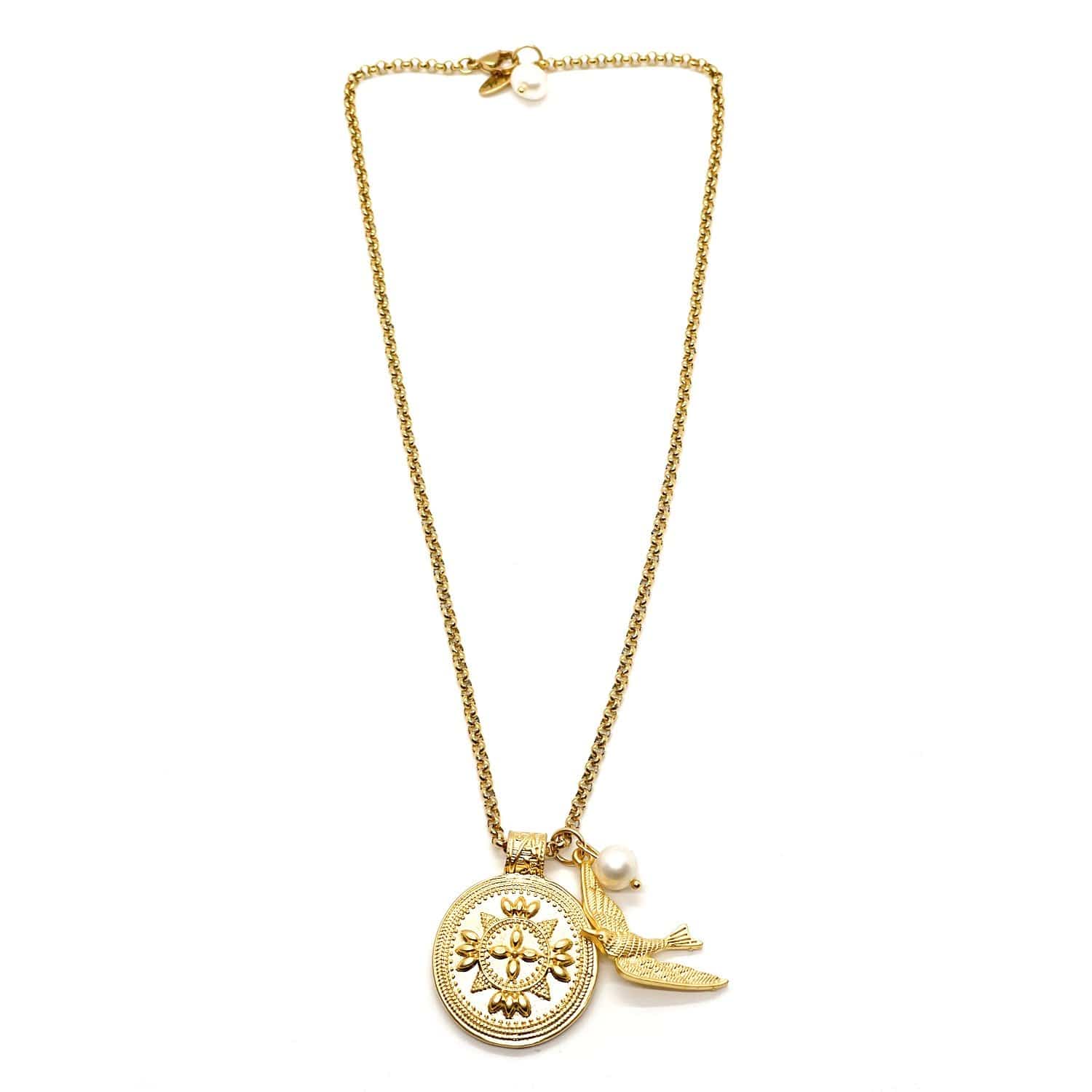 Swallow Bird Necklace inspired by the swallow bird symbolizing love, loyalty and peace. Swallow bird necklace is handmade with 18k gold plated stainless steel chain featuring 22k gold plated brass medallion pendant, 22k gold plated brass swallow bird pendant and green/white fresh pearl creating beautiful cluster necklace.