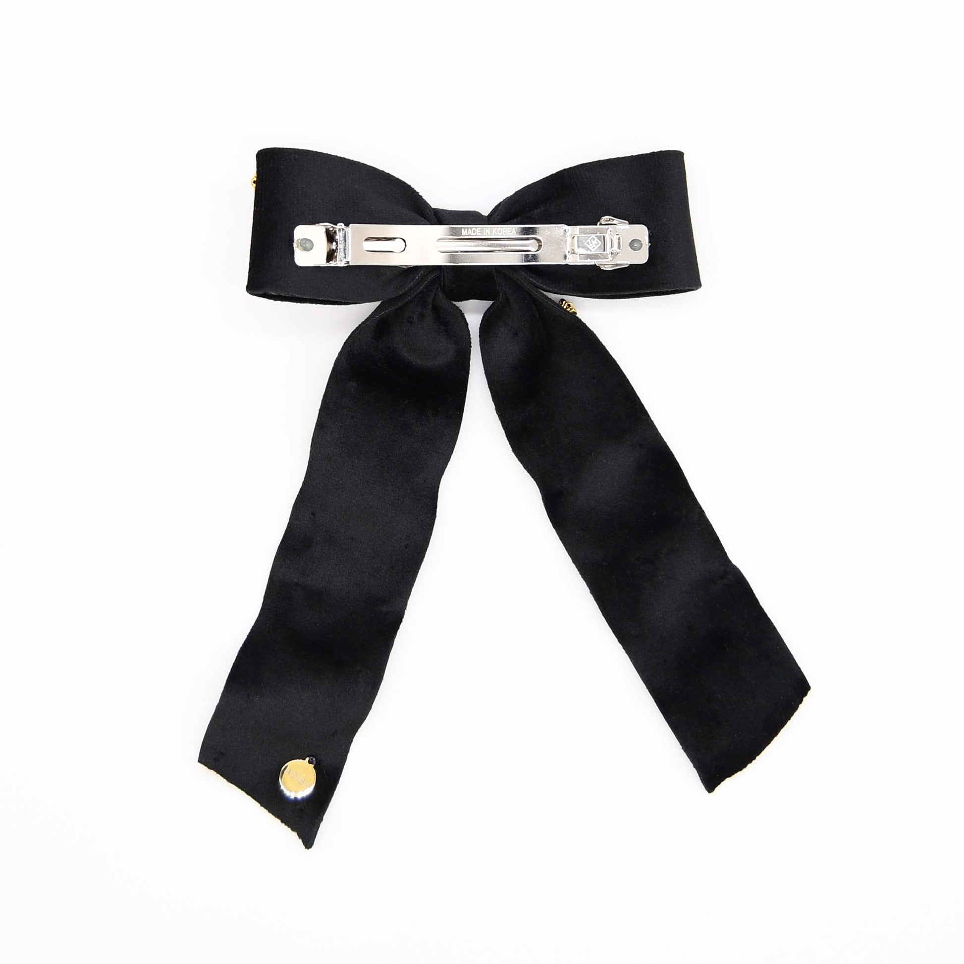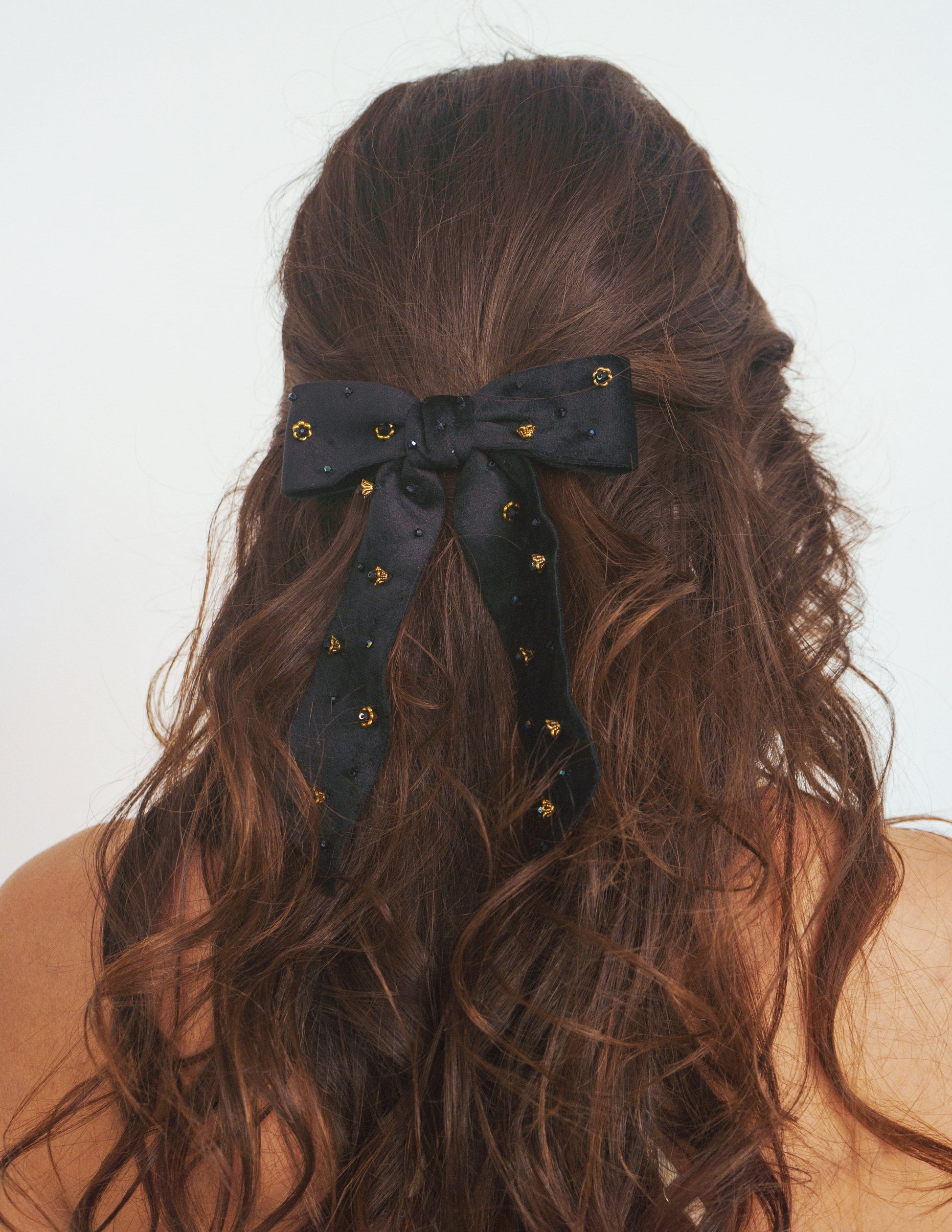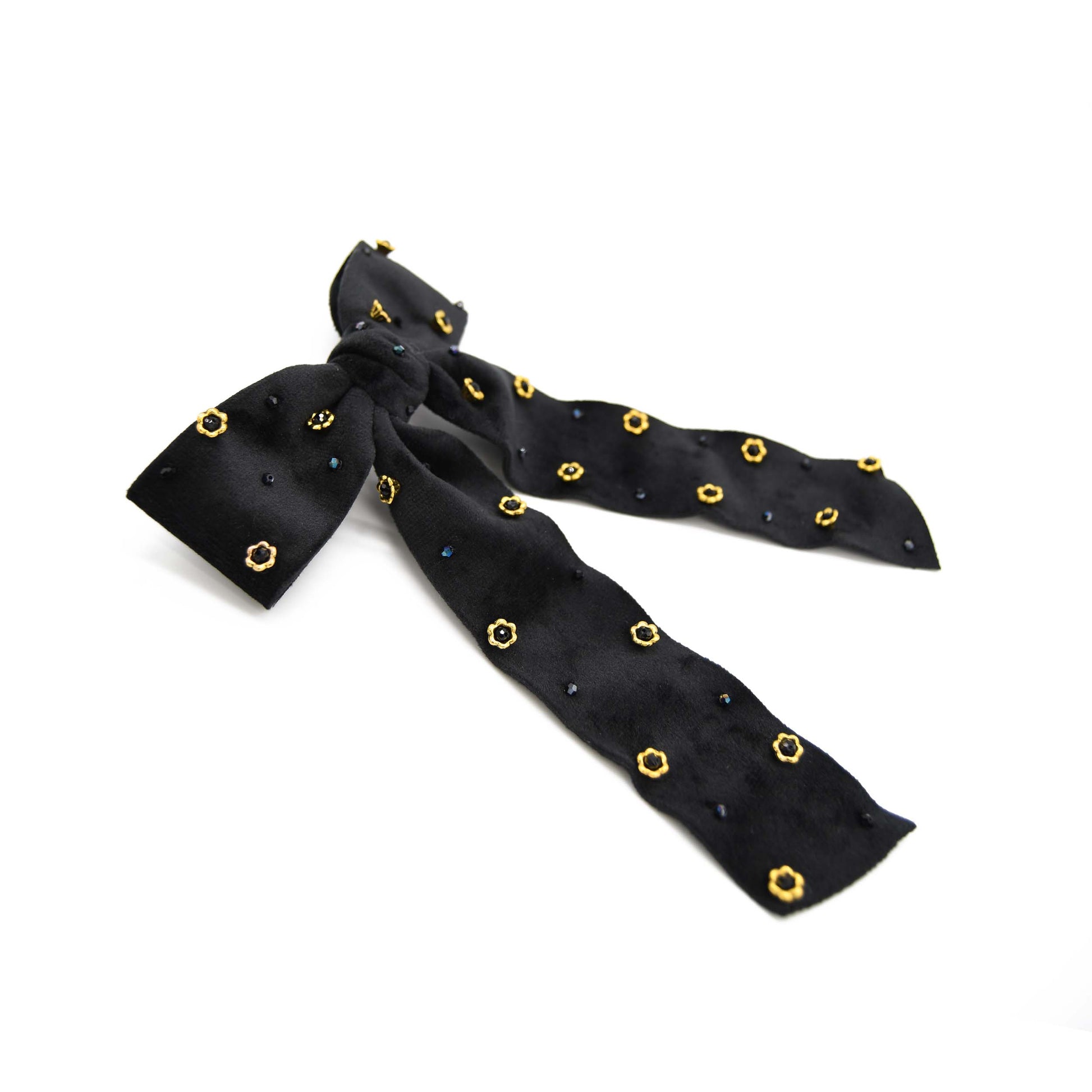 The Calla Barrette hair clip will add a beautiful hint of ladylike polish to any outfit. Hand sewn black iridescent crystals and gold details on a soft high quality suede, perfect when you need a chic & Classy finish your look. Pretty as a picture. Featuring a clip fastening and a bow detail.