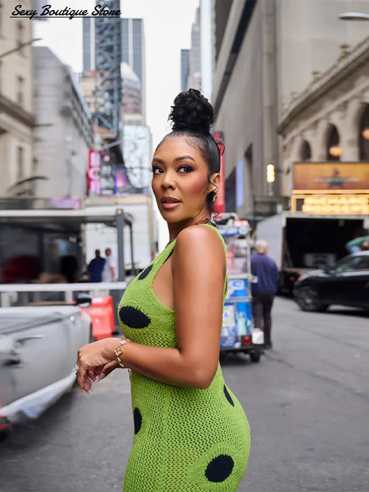 Women Sexy See Through Knitted Maxi Dress Hollow Out Deep Neck Pot Robes Tassel Hem Fork Party Vestidos 2025 New Lady Club Dress